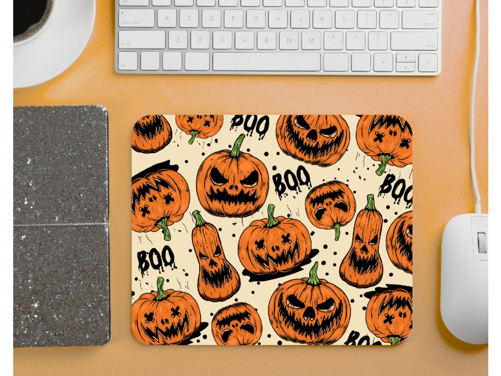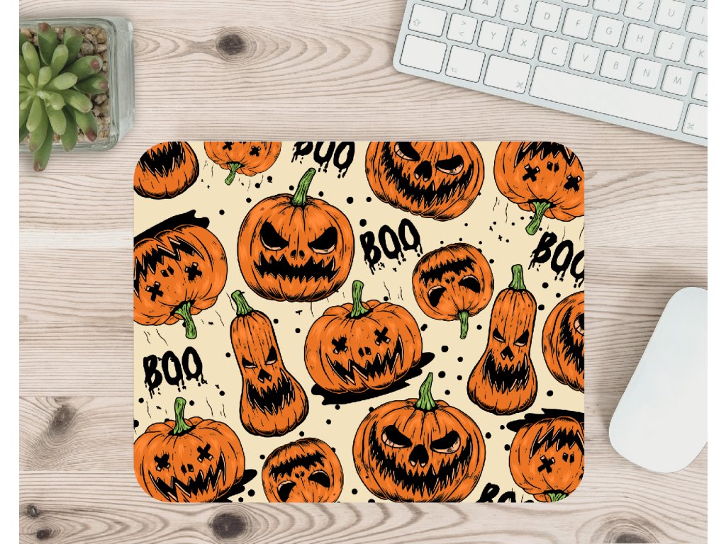 Originální Halloween podložka pod myš s motivem strašidelných dýní a nápisem BOO. Skvělý doplněk pro temnou i hravou atmosféru u počítače. 🎃🕷️