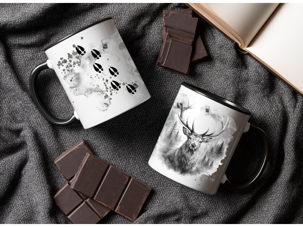 Stylový keramický hrnek s majestátním jelenem a stopami je ideální dárek pro milovníky přírody, Šumavy a jedinečných ručně vyráběných kousků.