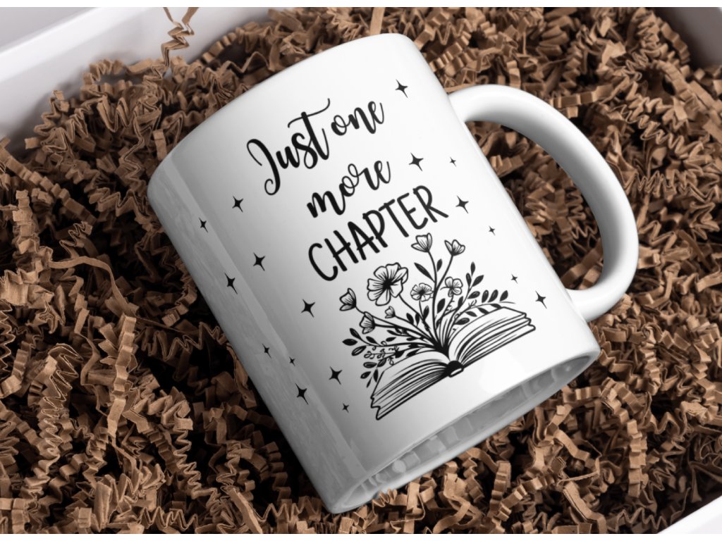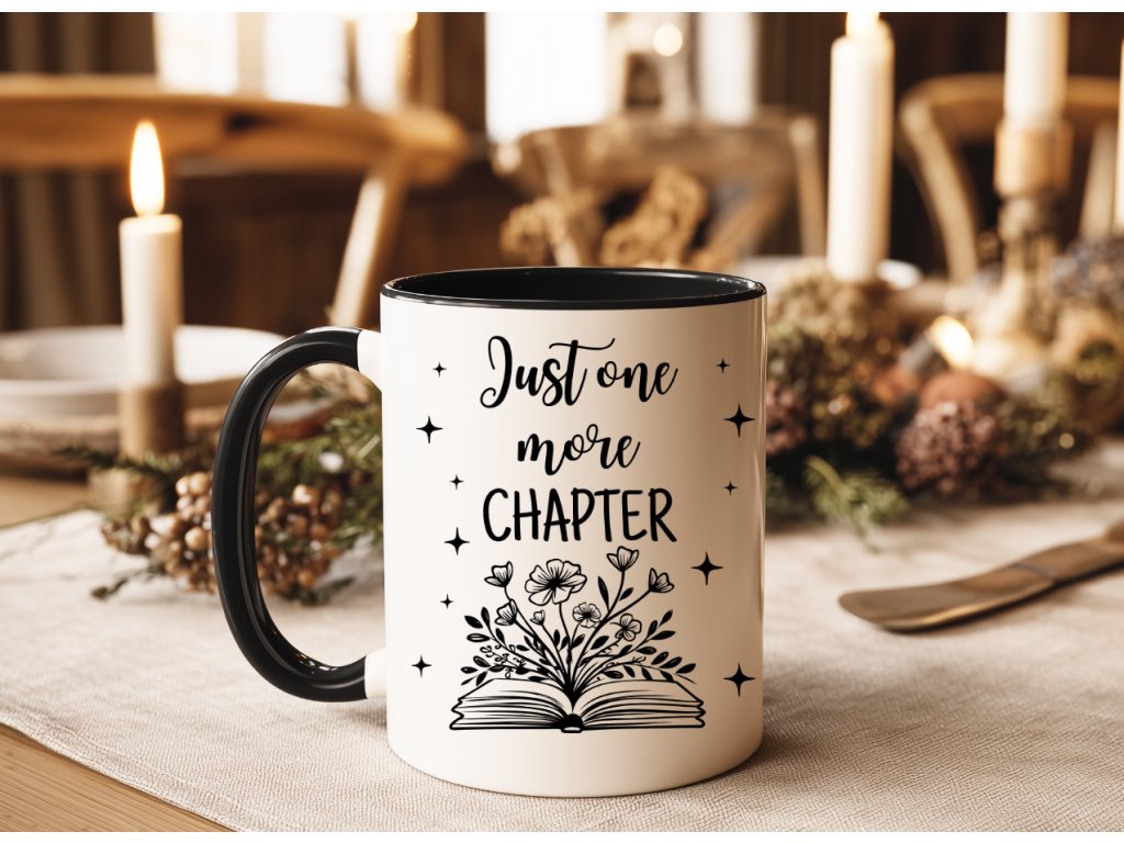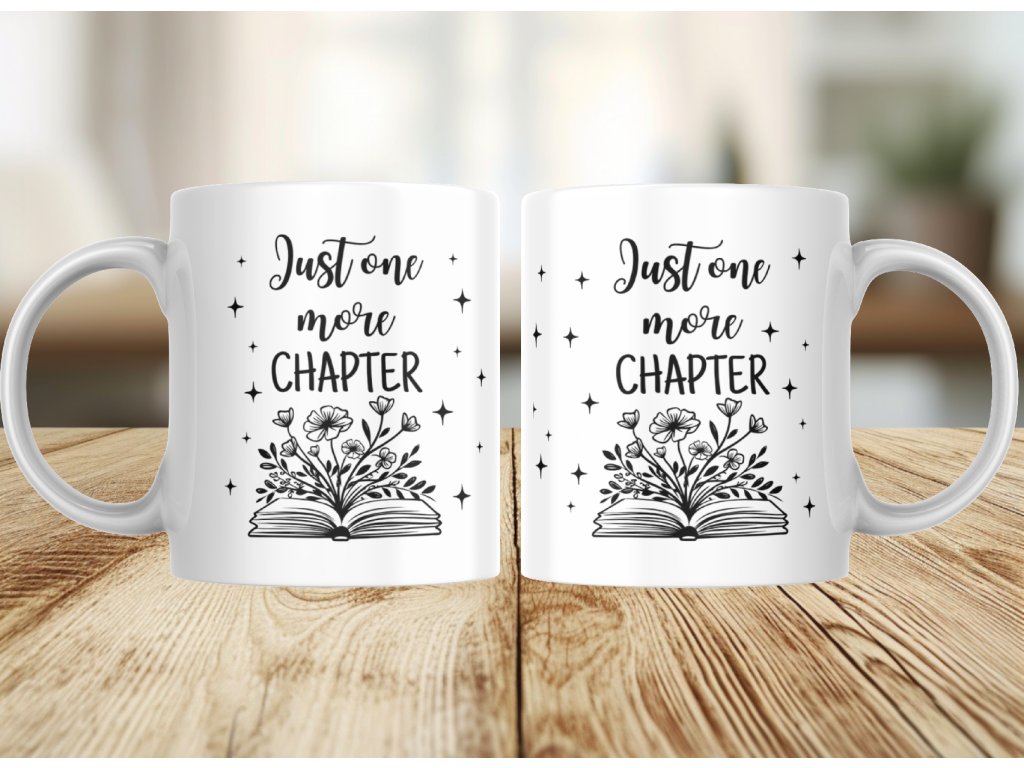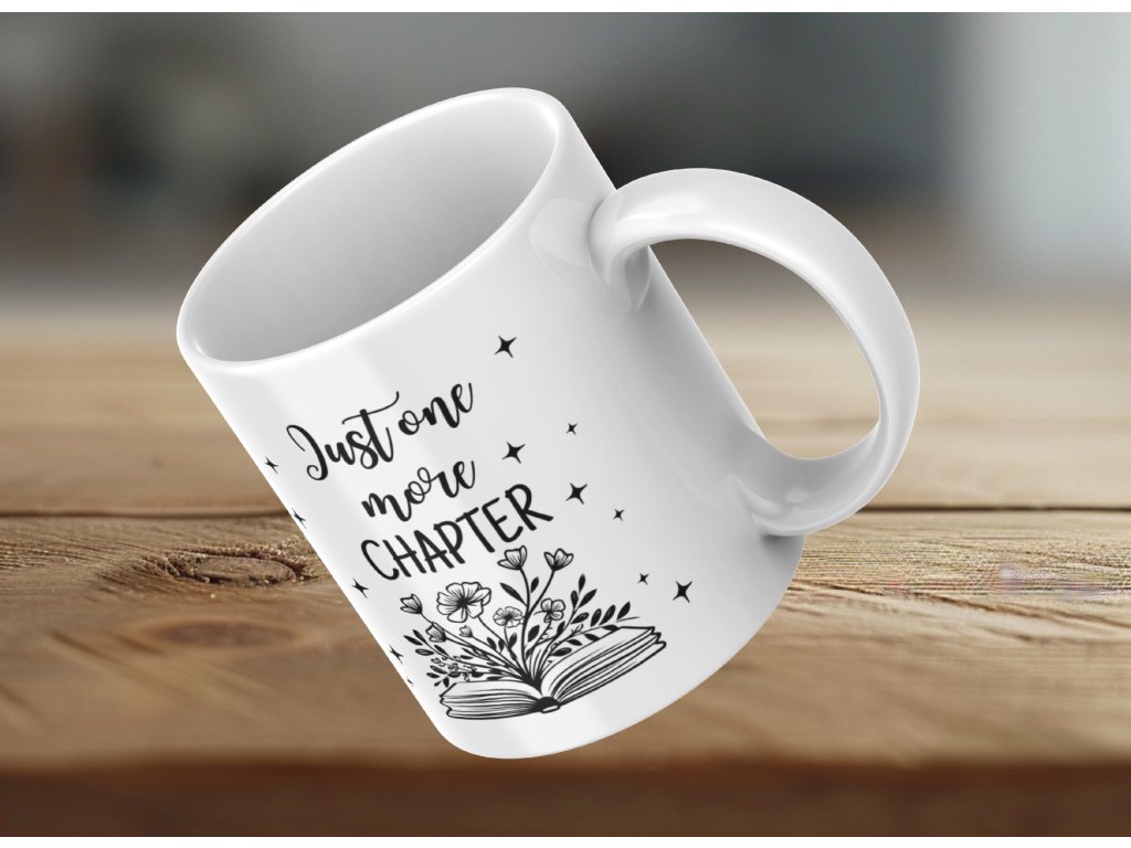 330 ml - Hrnek „Just one more chapter“ pro všechny knihomolky – jemné hvězdičky a ilustrace otevřené knihy s květinami. Ideální k čaji, kávě i večernímu čtení. ✨