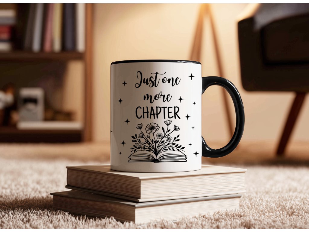 Ještě jednu kapitolu… a pak už fakt jdu spát 😄 Pokud se v tom poznáváte, tenhle hrnek je přesně pro vás. Hrnek s nápisem „Just one more chapter“ a ilustrací otevřené knihy s květinami je malá radost pro všechny, kdo milují vůni stránek, klidné večery a horký nápoj po ruce.