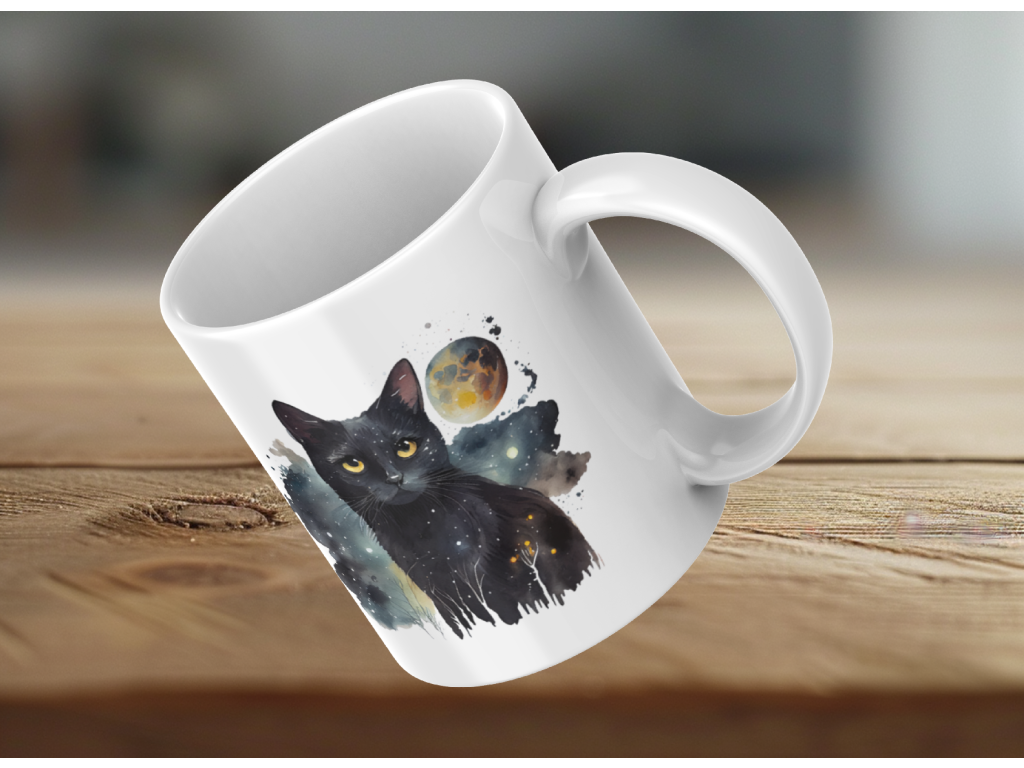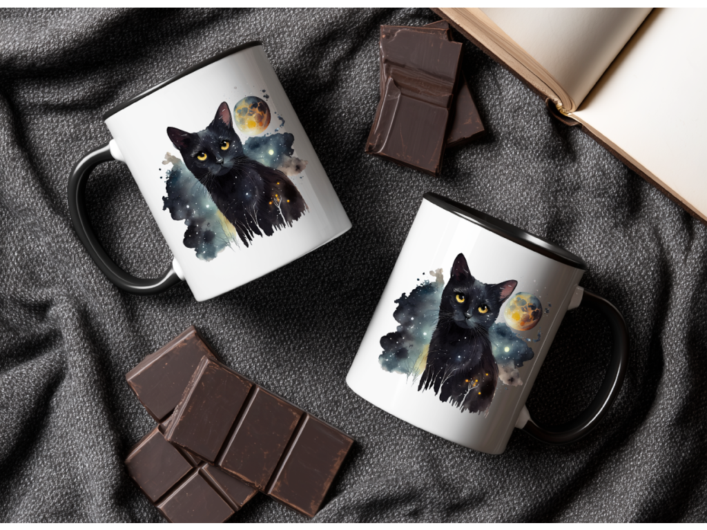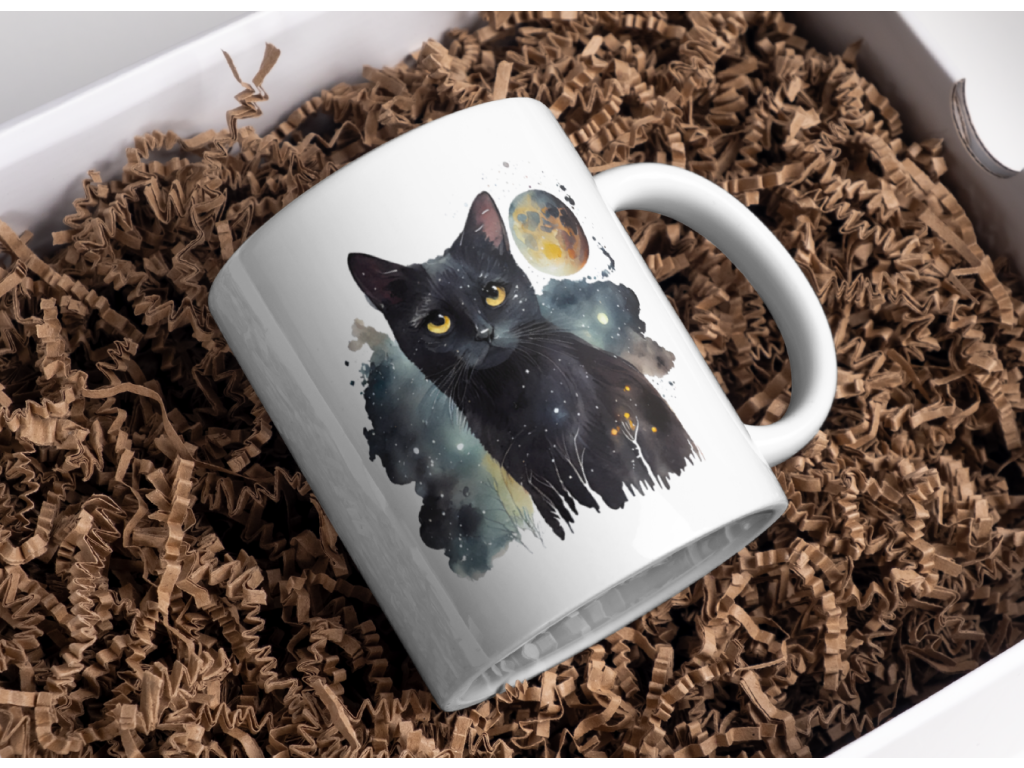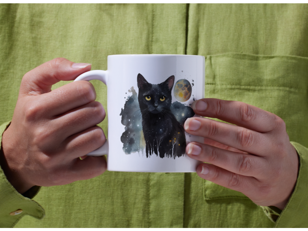 Pro všechny milovníky koček a vesmírného tajemství je tady jedinečný hrnek s designem tajemné černé kočky, která v sobě nese hloubku hvězdné oblohy. 🐈⬛🌟