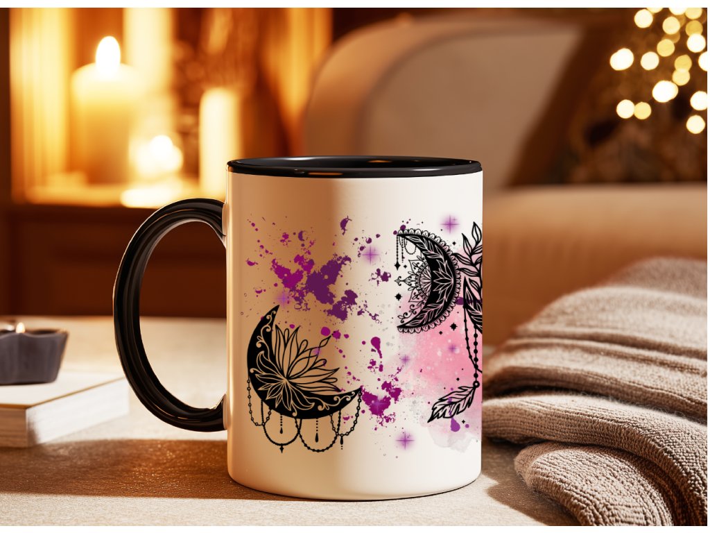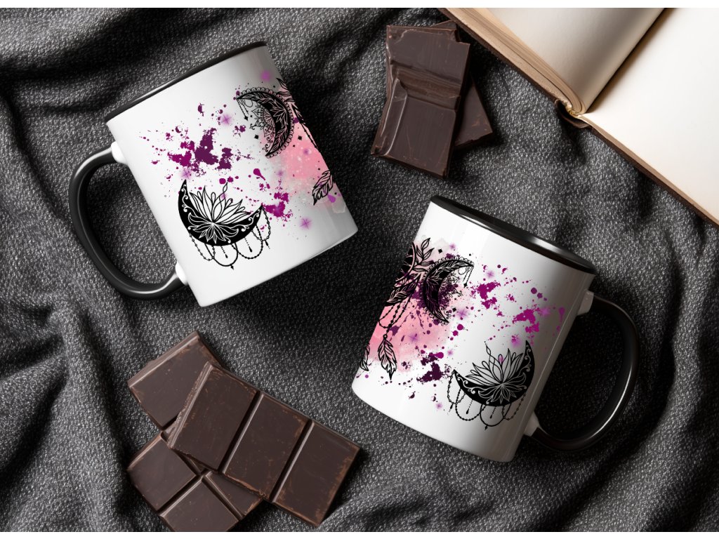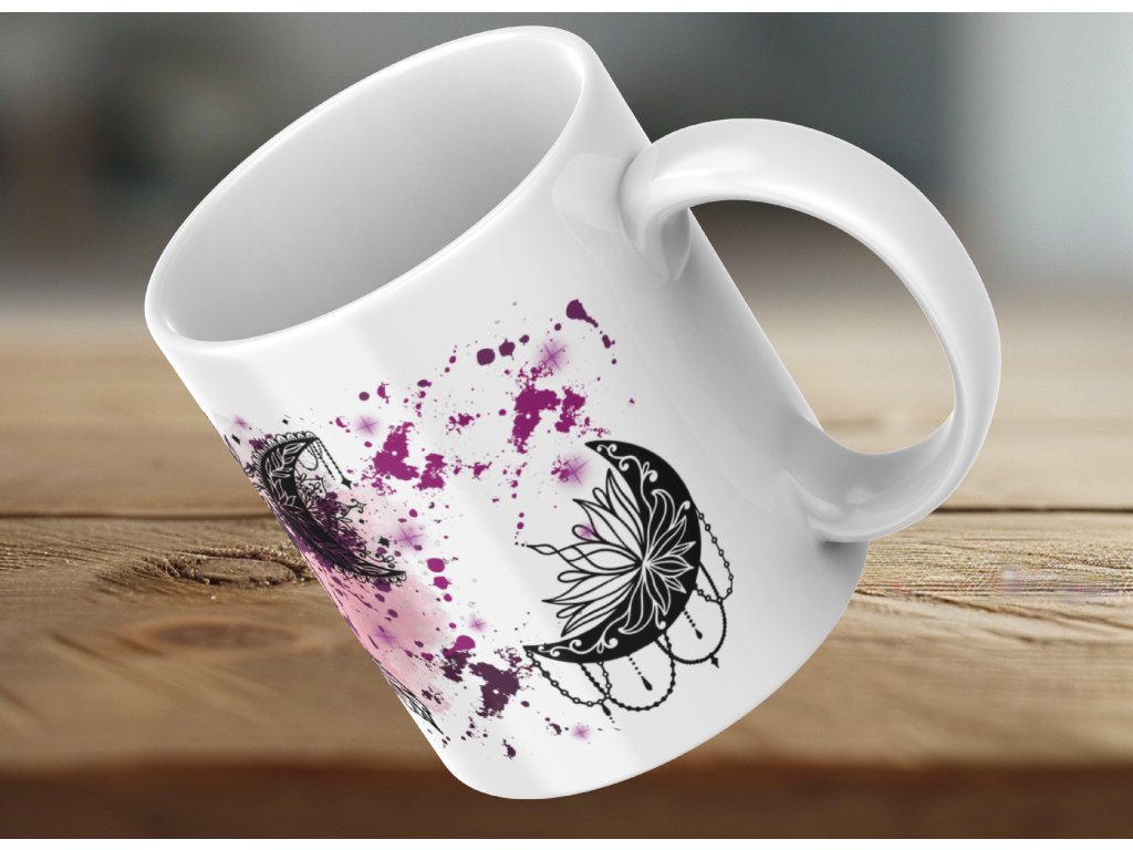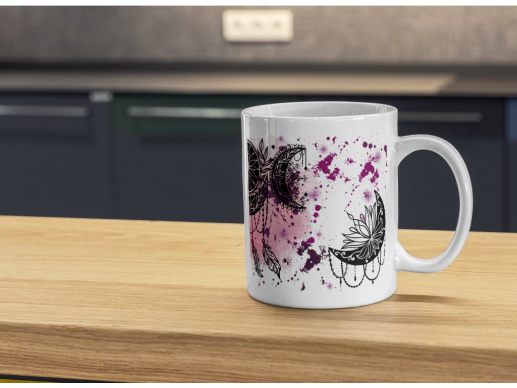 Nechte se okouzlit magií snů s tímto originálním hrnkem zdobeným černobílým motivem lapače snů a měsíců, doplněným fialovým „ink splash“ pozadím. Spojení mystiky, elegance a smyslu pro detail dělá z tohoto hrnku perfektní kousek pro všechny milovníky boho stylu, duchovna nebo jen originálního designu.
