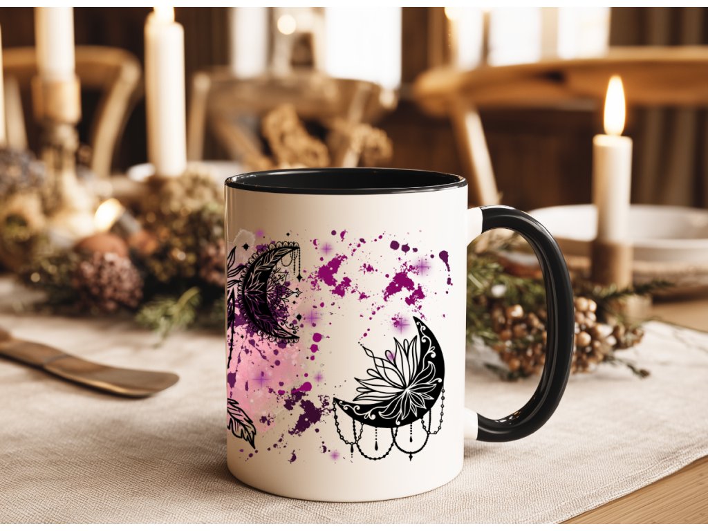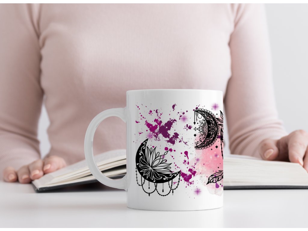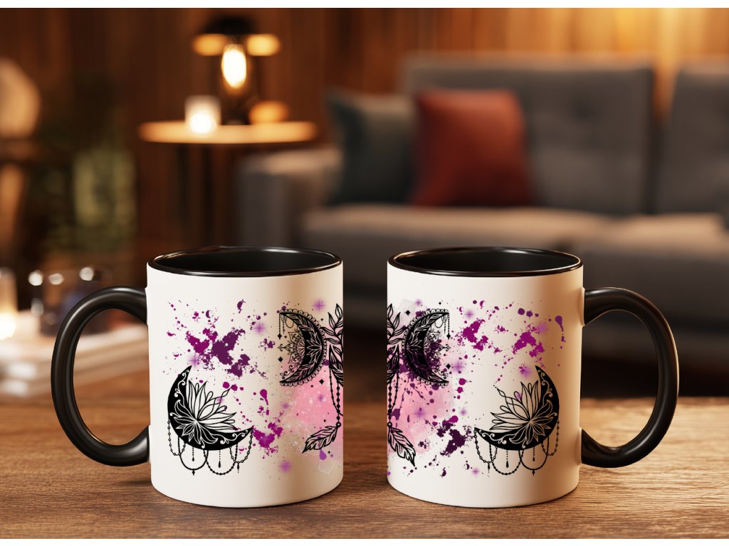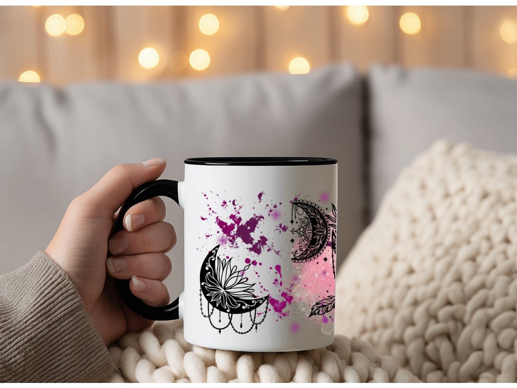 Nechte se okouzlit magií snů s tímto originálním hrnkem zdobeným černobílým motivem lapače snů a měsíců, doplněným fialovým „ink splash“ pozadím. Spojení mystiky, elegance a smyslu pro detail dělá z tohoto hrnku perfektní kousek pro všechny milovníky boho stylu, duchovna nebo jen originálního designu.