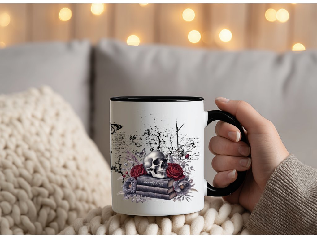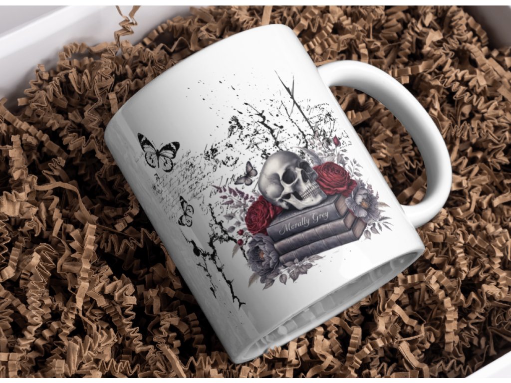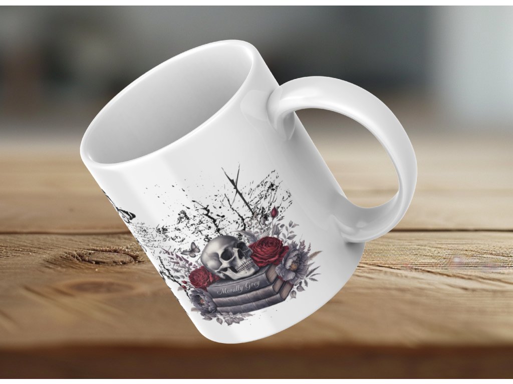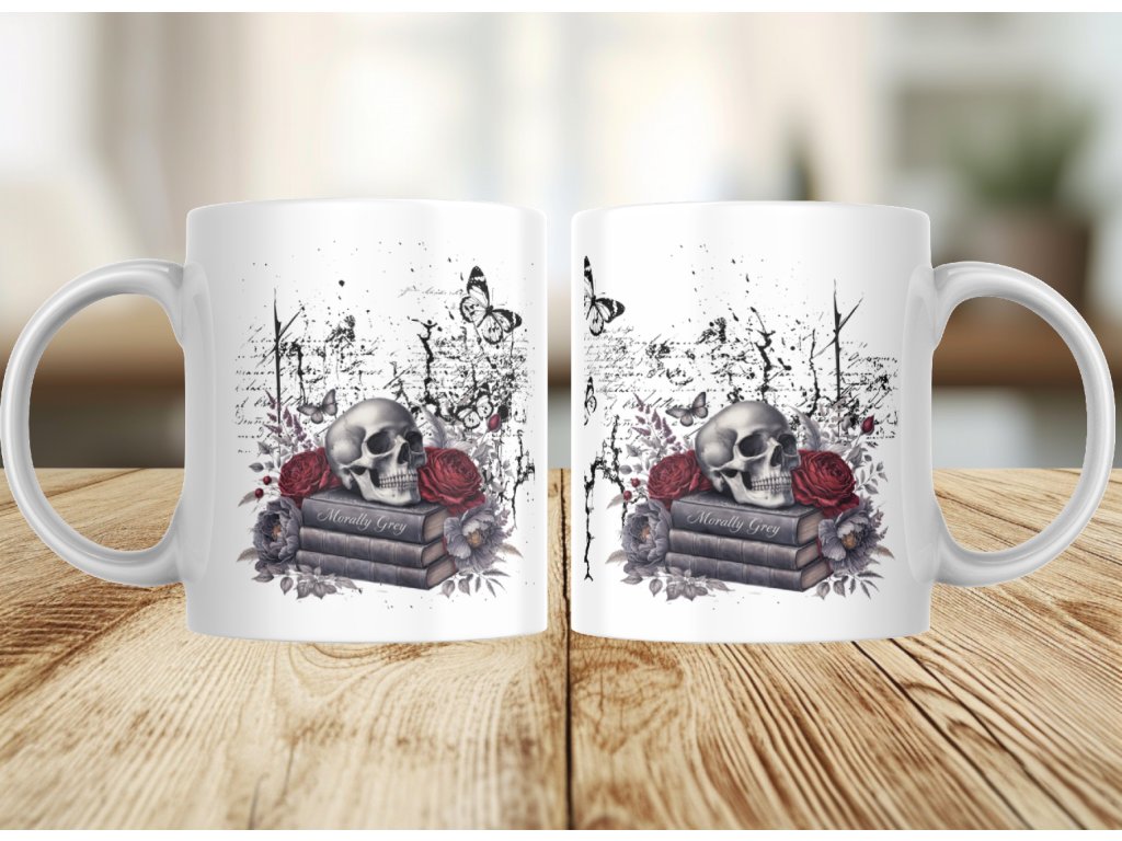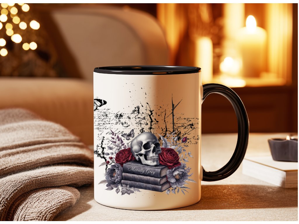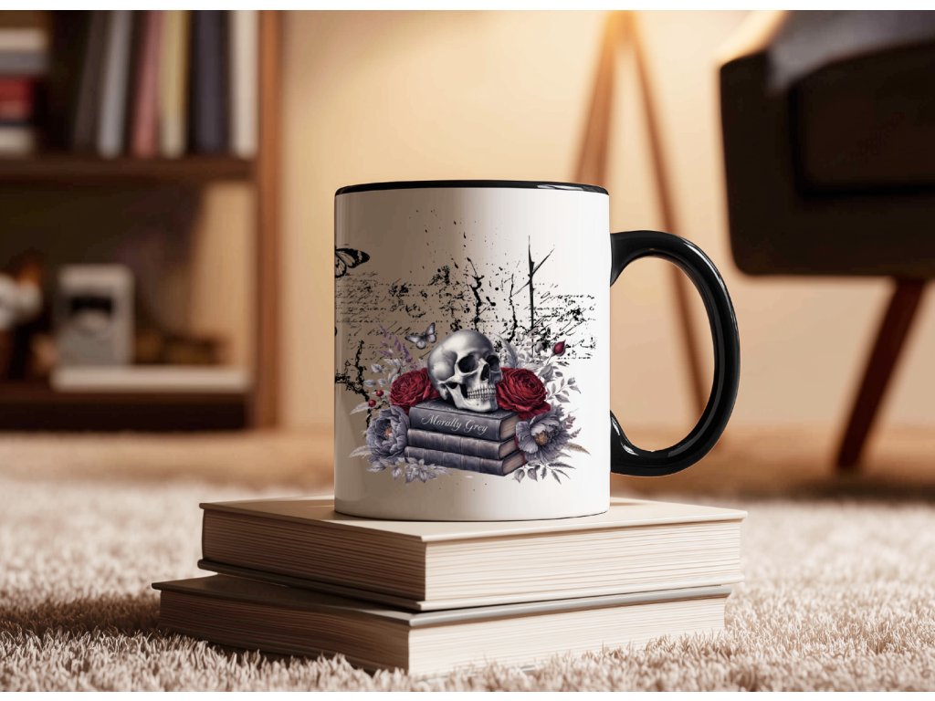 Dark romance hrnek Morally Grey ☠️📚🖤 – lebka, růže a knihy pro všechny knihomoly se slabostí pro „morally grey“ postavy. Ve 2 barevných variantách