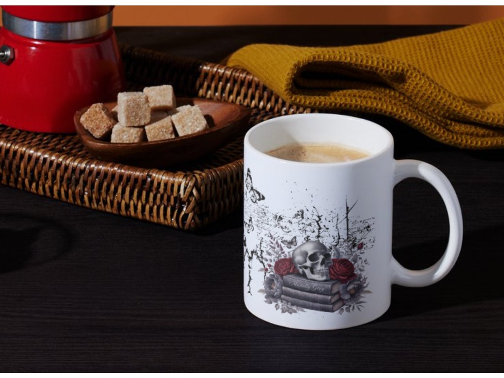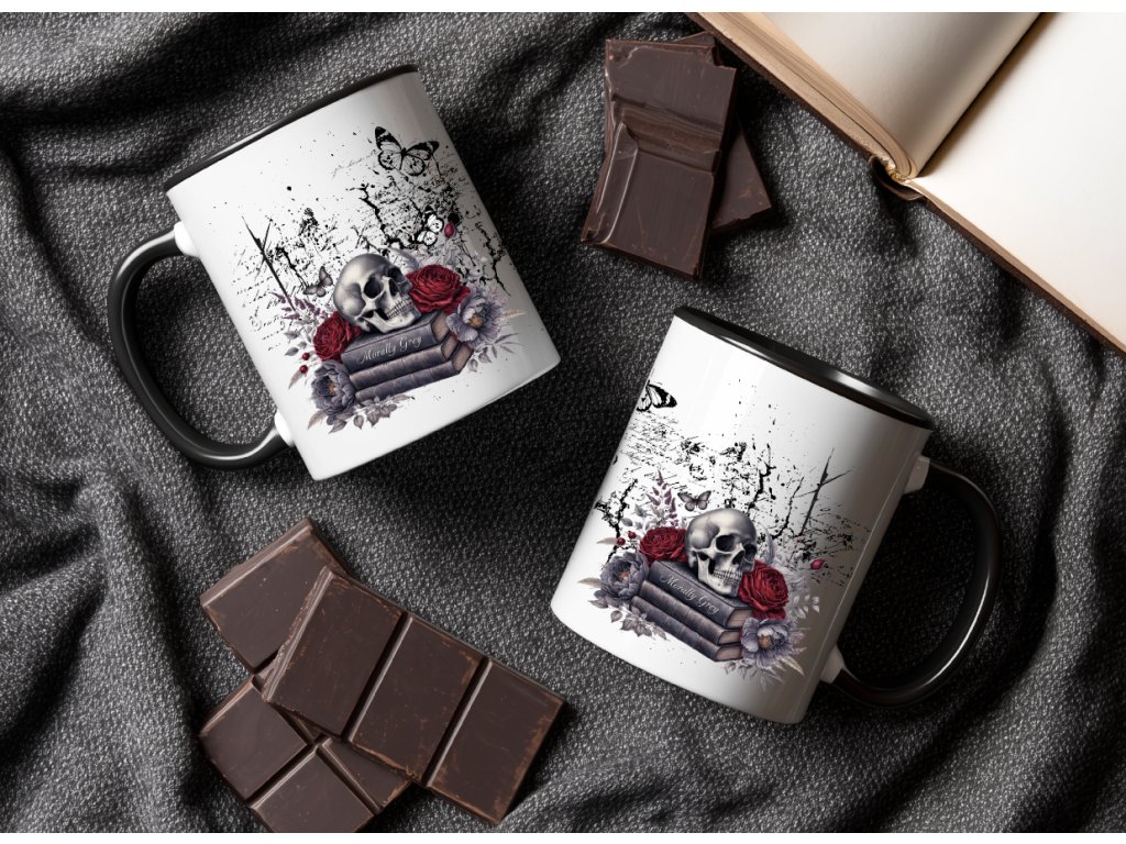 Pokud milujete dark romance, napětí mezi stránkami a postavy, které jsou… no, prostě morally grey 🖤, tenhle hrnek je přesně pro vás. Ilustrace lebky, knih a temných květů vytváří výrazný, lehce gotický vibe – ideální ke kávě, čaji i horké čokoládě během čtení.
