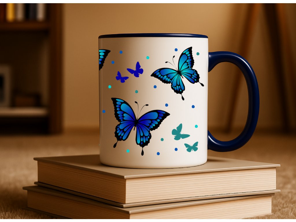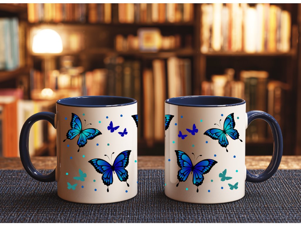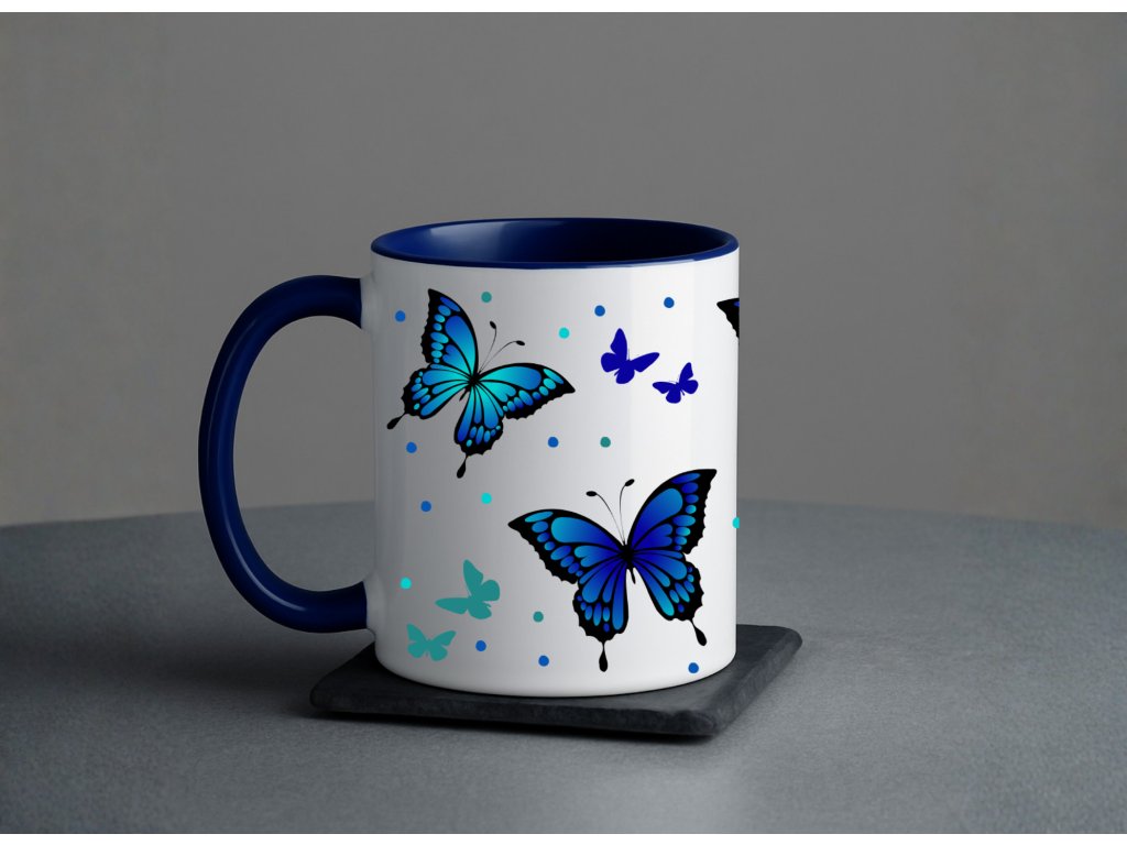 - Hrnek s modrým vnitřkem a ouškem - modří motýlci