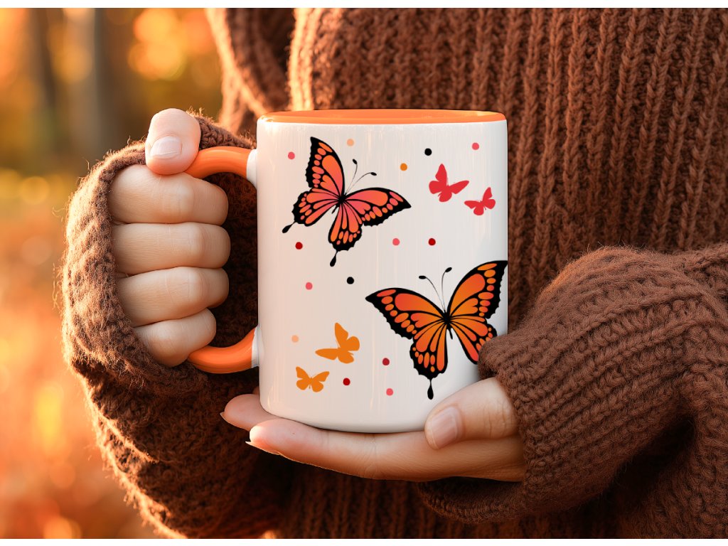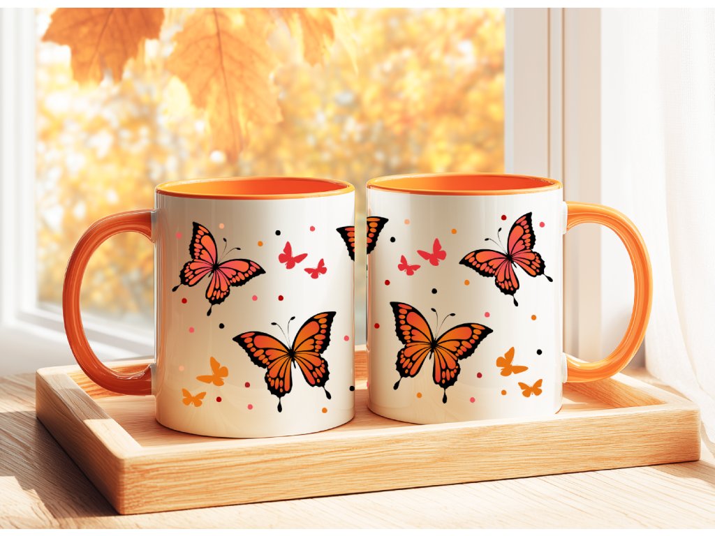 - Hrnek s oranžovým vnitřkem a ouškem - oranžoví motýlci