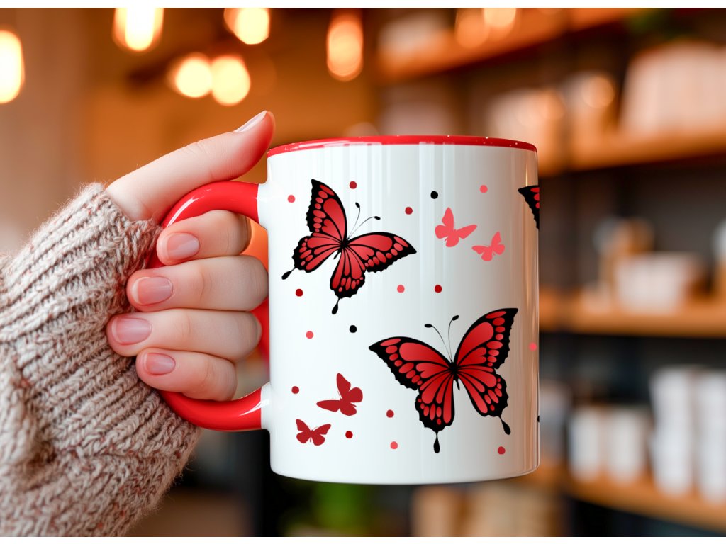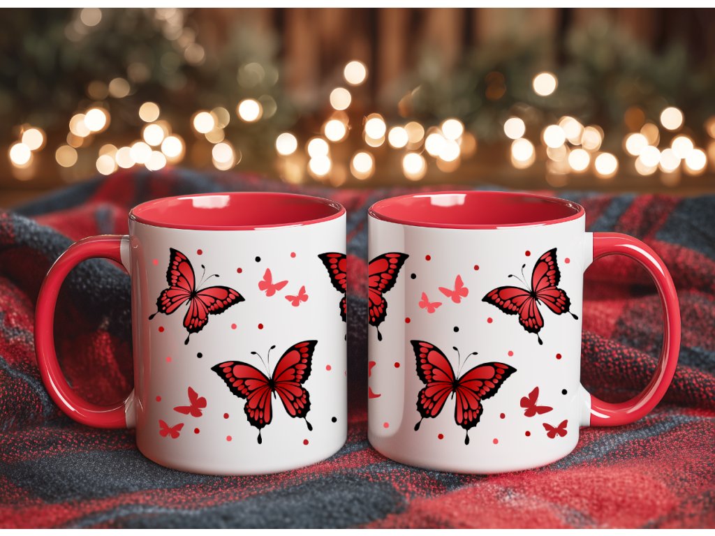 - Hrnek s červeným vnitřkem a ouškem - červení motýlci