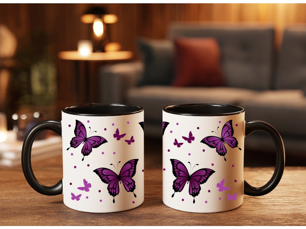 - Hrnek s černým vnitřkem a ouškem - fialoví motýlci