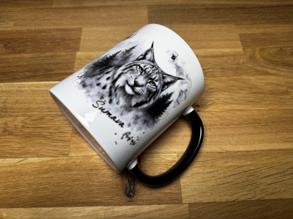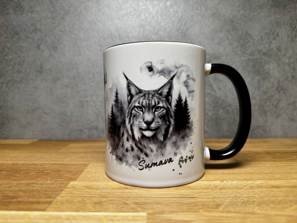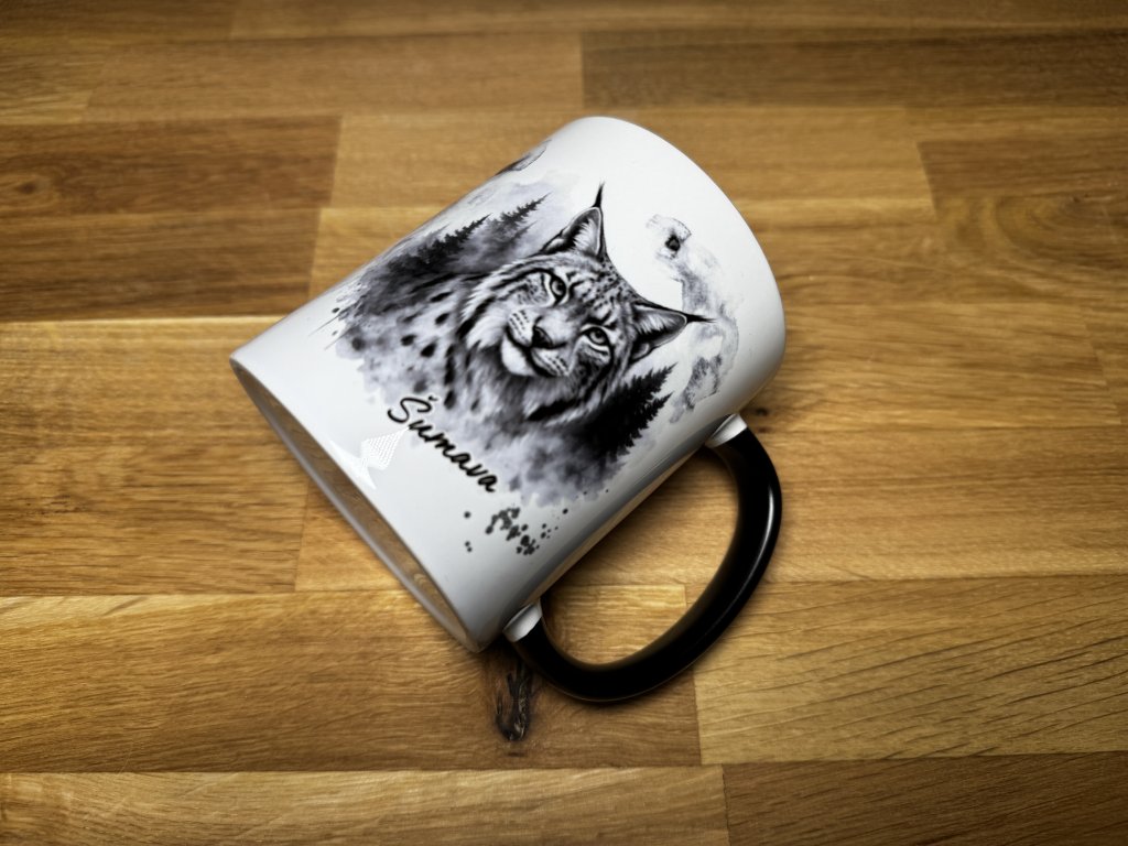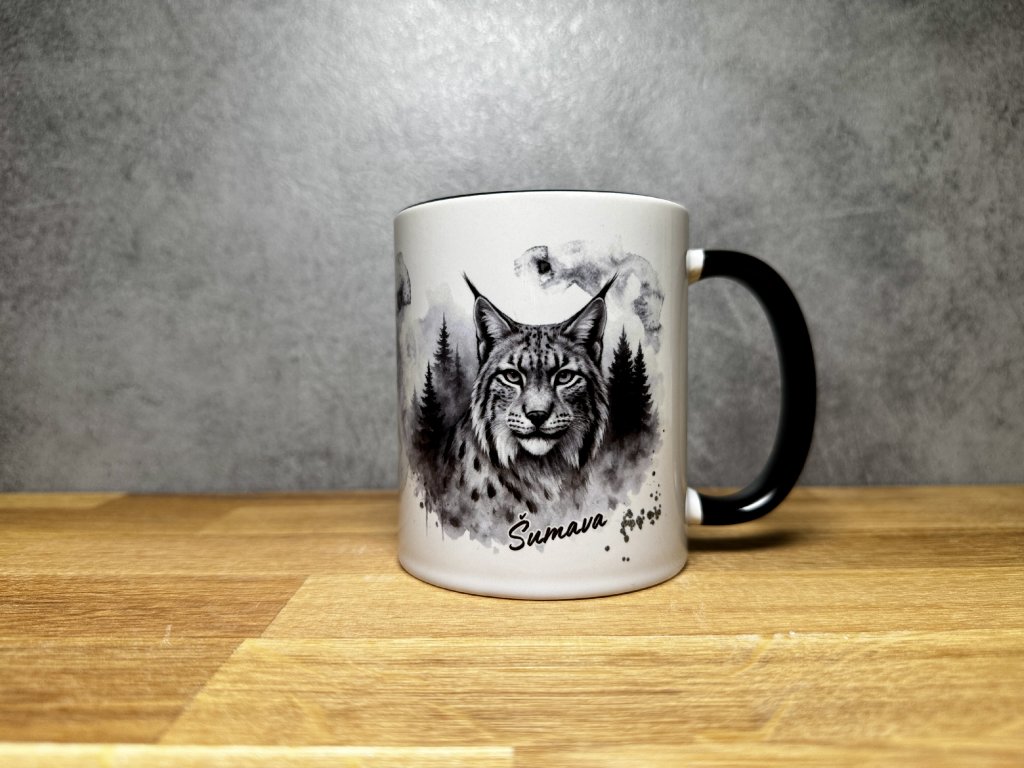 330 ml - Hrnek ze Šumavy - Stylový hrnek s motivem rysa a černým vnitřkem i ouškem 🐾🌲