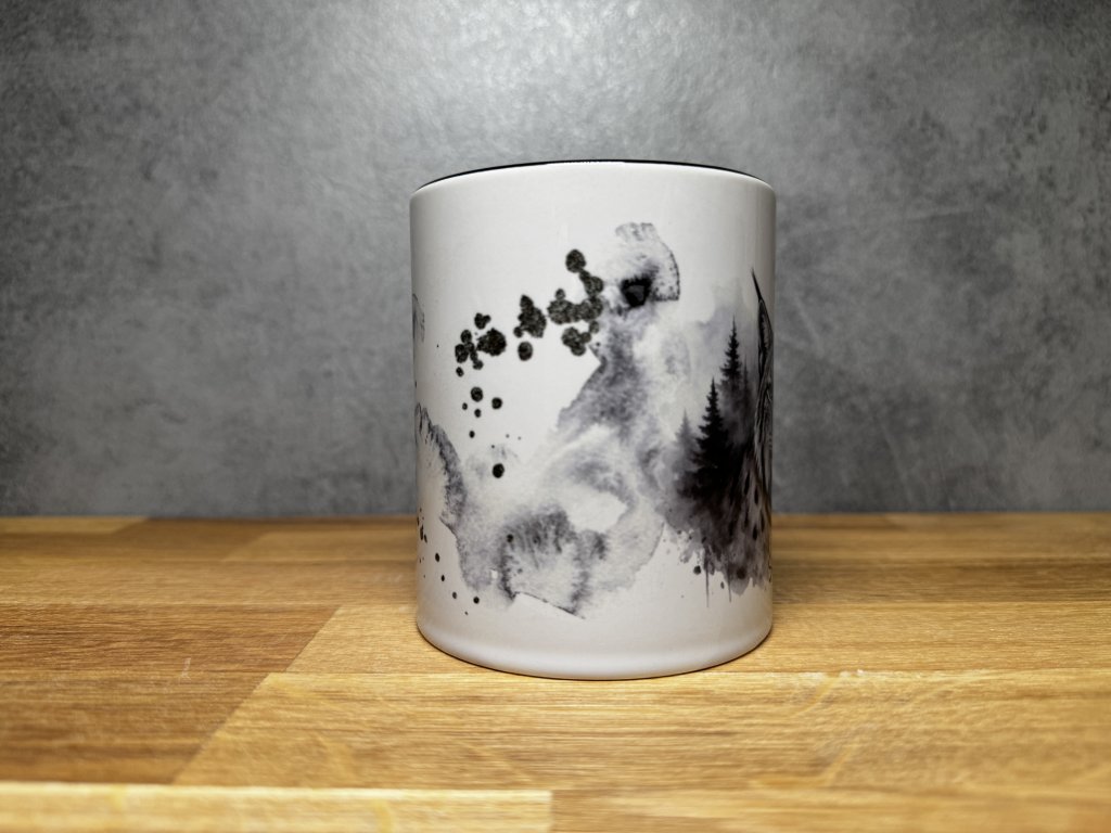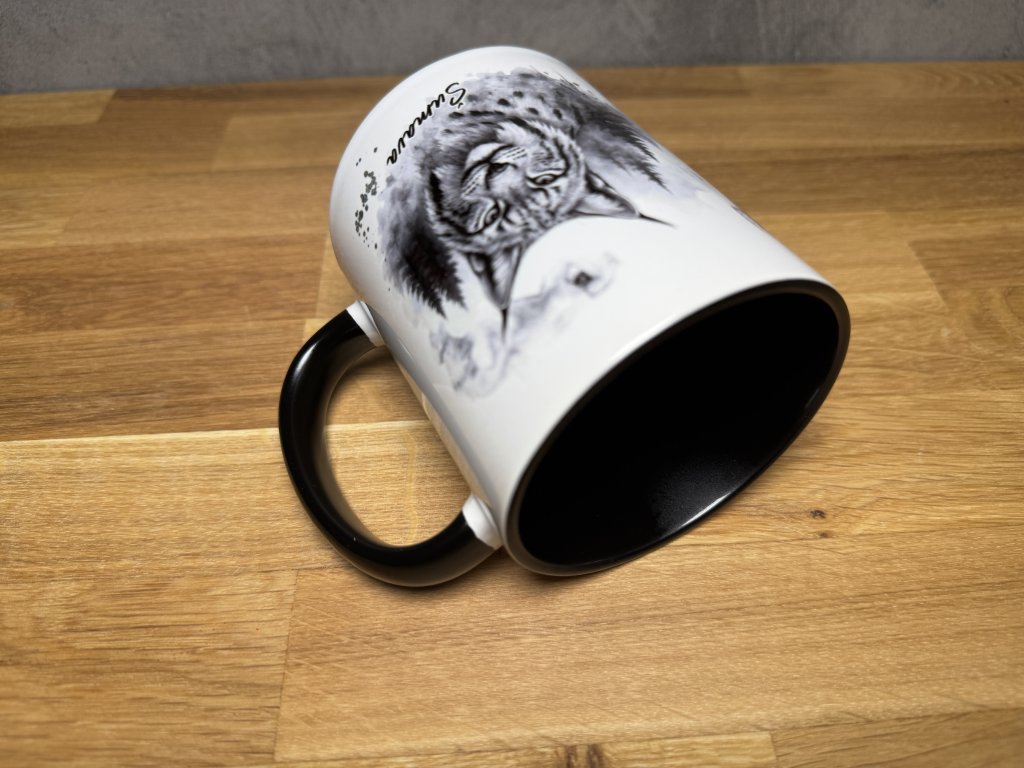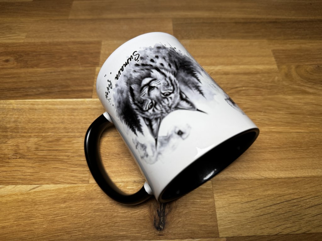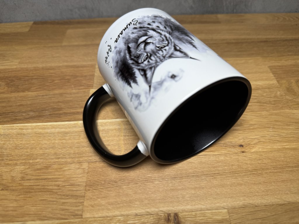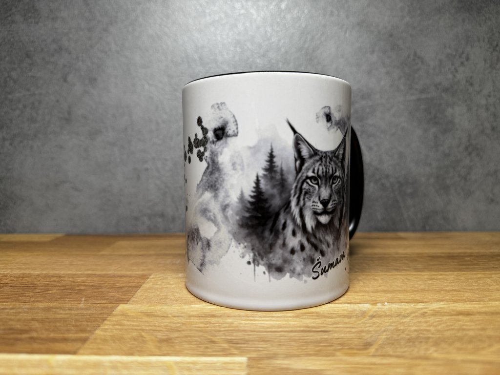 330 ml - Hrnek ze Šumavy - Stylový hrnek s motivem rysa a černým vnitřkem i ouškem 🐾🌲