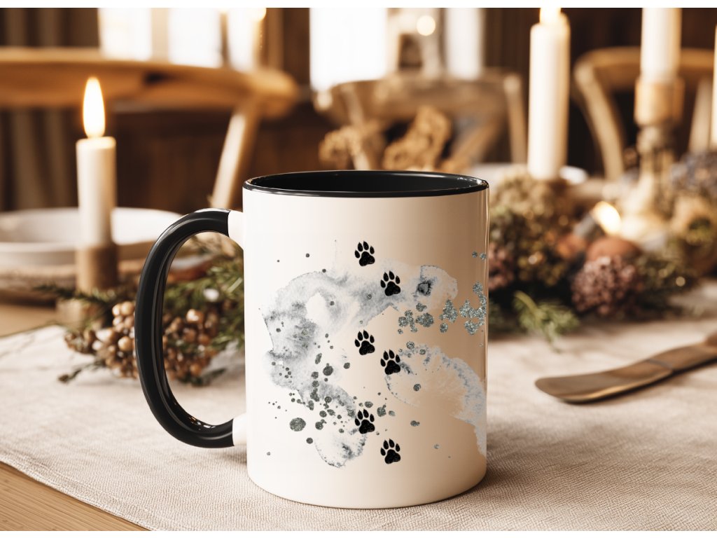 Motiv doplňují jemné akvarelové cákance a na druhé straně najdeš drobné detaily (tlapky), které hrnek krásně dotahují do celku 🐾