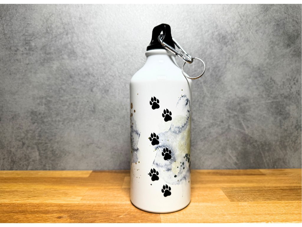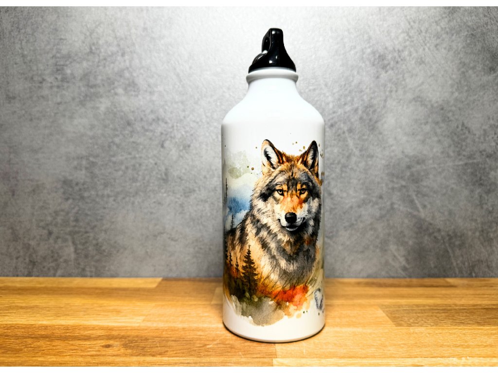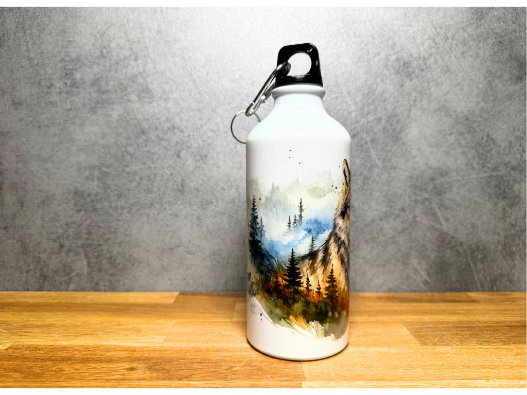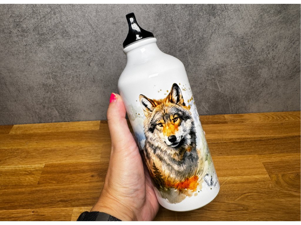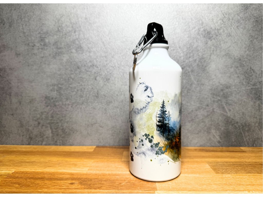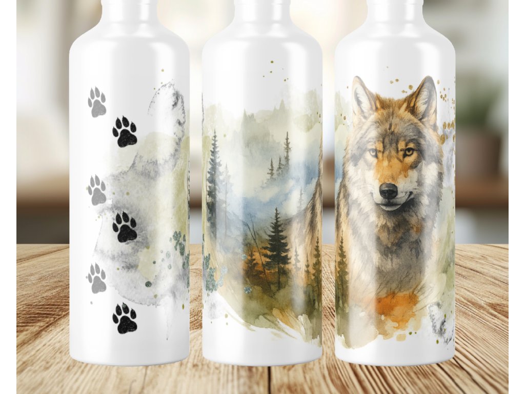 Stylová hliníková lahev s potiskem vlka v jemném akvarelovém designu inspirovaném přírodou a Šumavou 🐺🌲 Originální motiv doplňují také tlapky, takže lahev potěší milovníky vlků, lesa i zvířecích motivů.