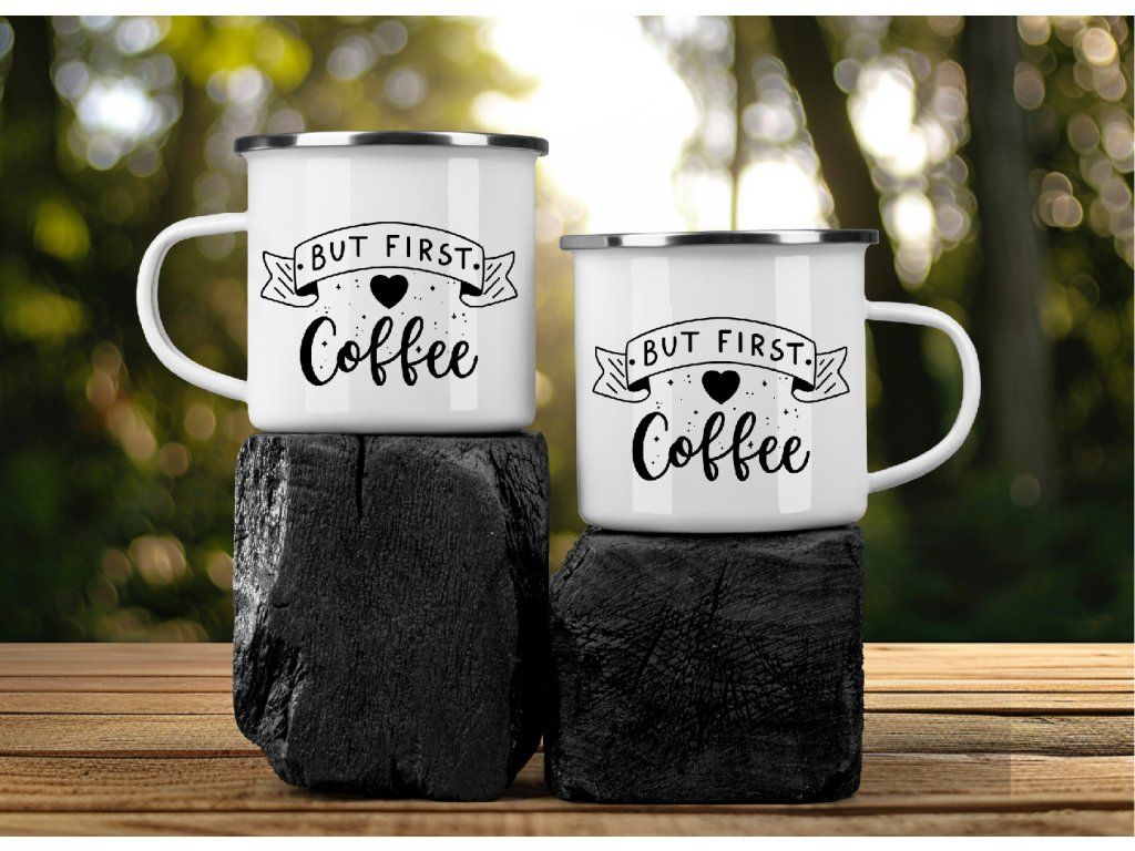 Smaltovaný hrnek - plecháček s nápisem But first coffee 380 ml - ideální pro všechny milovníky ranní kávy. 🤍☕