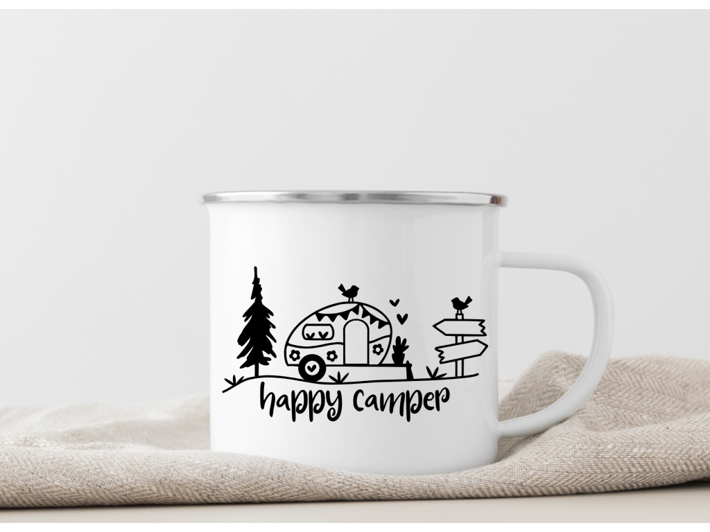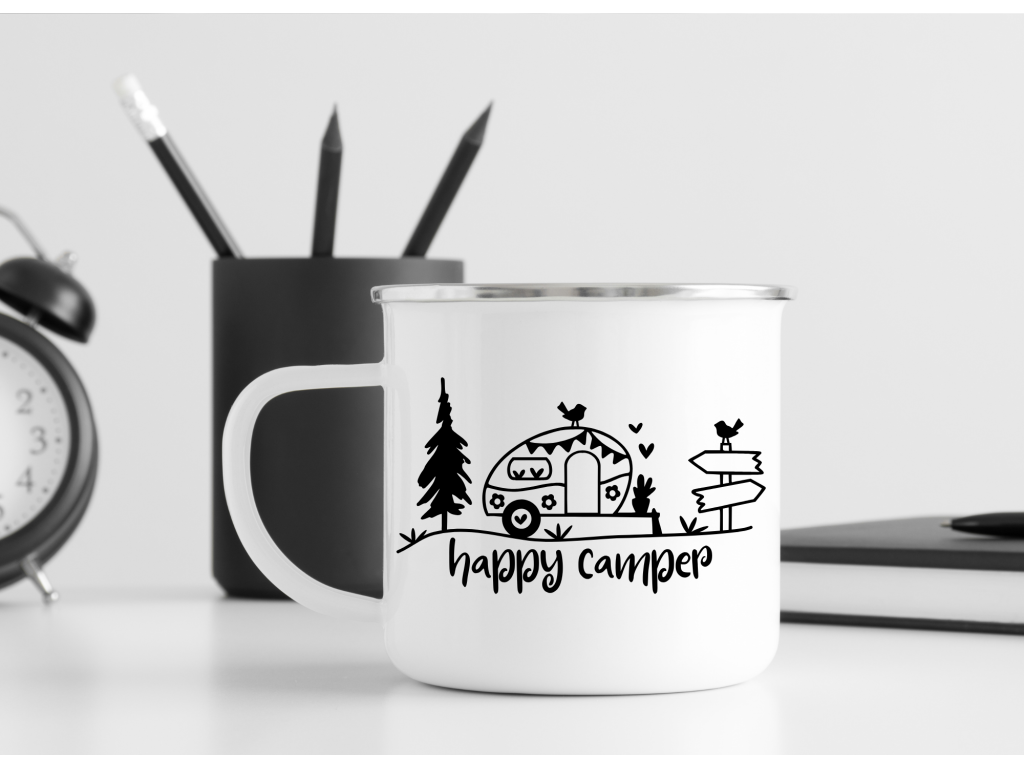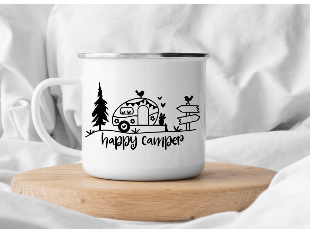 Originální plecháček camper s motivem karavanu, stromků a nápisem Happy Camper je ideální volbou pro všechny, kdo milují cestování, spaní v přírodě a svobodu na cestách 🏕️ Jednoduchý černobílý design působí mile, hravě a krásně vystihuje pohodovou atmosféru kempování.