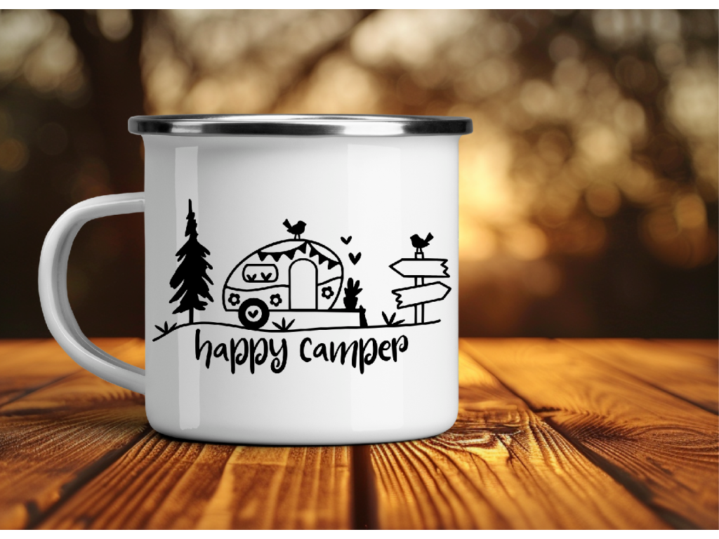 Originální plecháček camper s motivem karavanu a nápisem Happy Camper potěší všechny milovníky cestování, kempování a pohody v přírodě.
