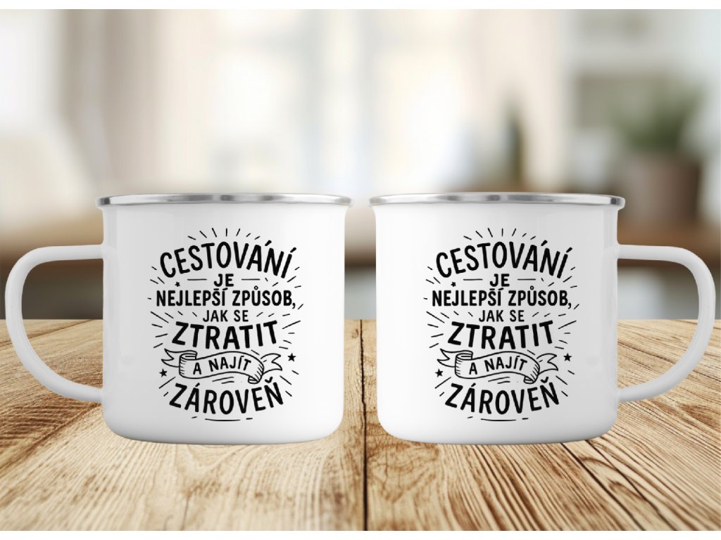 Smaltovaný plecháček s nápisem Cestování je nejlepší způsob, jak se ztratit a najít zároveň. Lehký, stylový a ideální na cesty, do přírody i jako dárek pro dobrodruhy 🌍