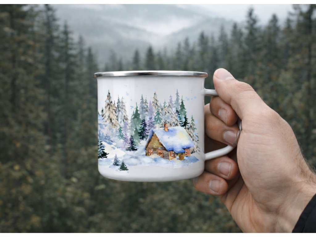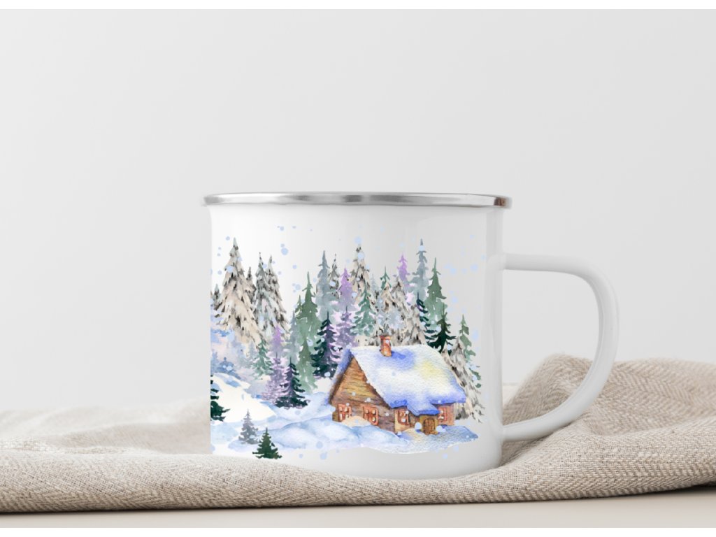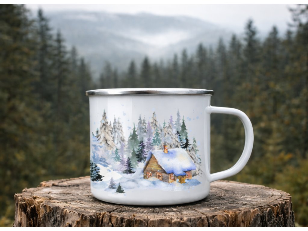 Smaltovaný plecháček s motivem zimních šumavských chaloupek ❄️🏡 Kouzelný hrnek pro milovníky Šumavy, zimní přírody a útulné horské atmosféry.