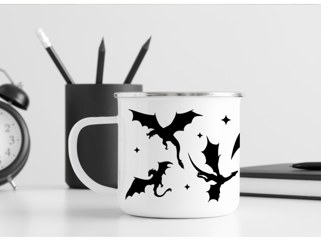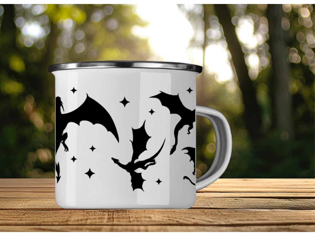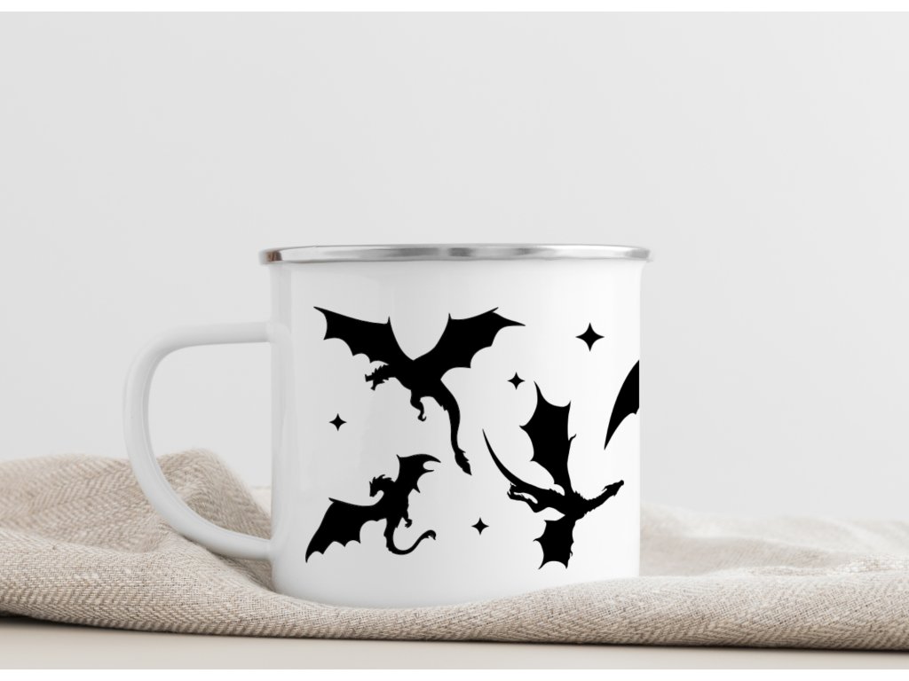 Smaltovaný plecháček s draky 🐉✨ Minimalistický černobílý potisk, který sedne na kávu, čaj i dobrodružství venku.