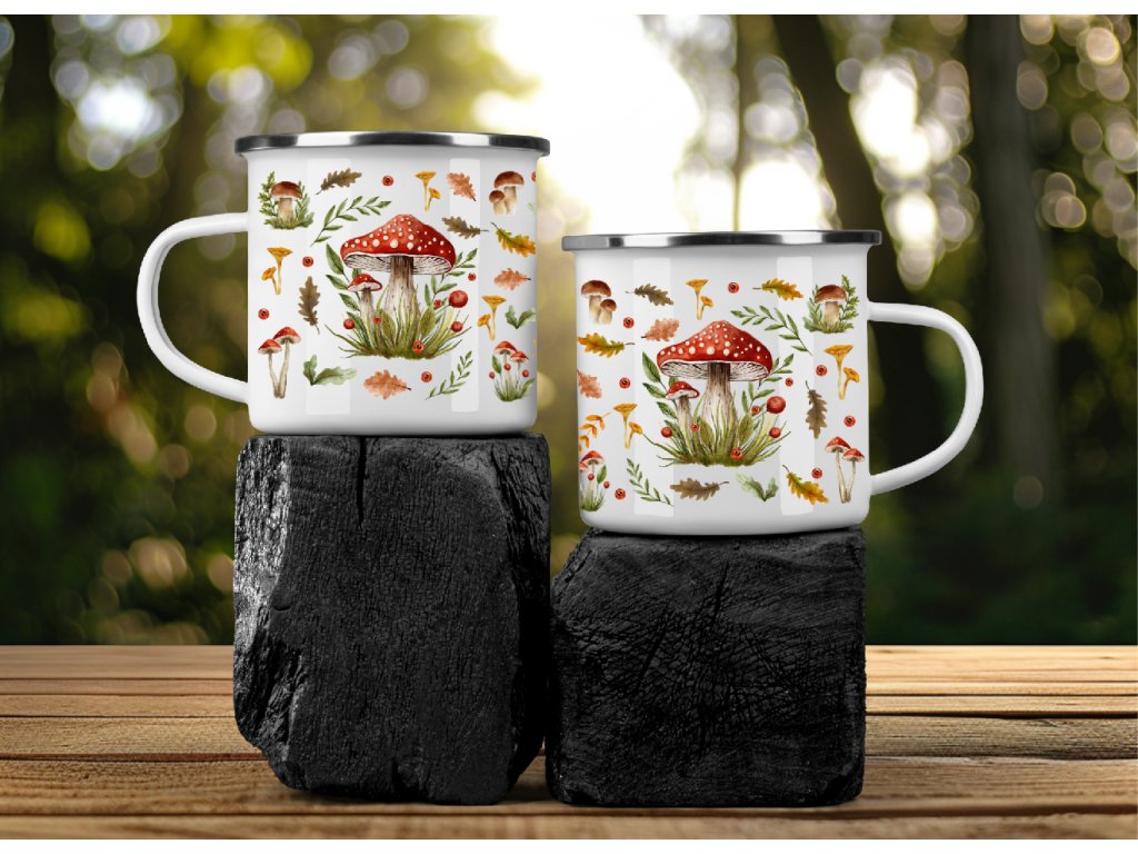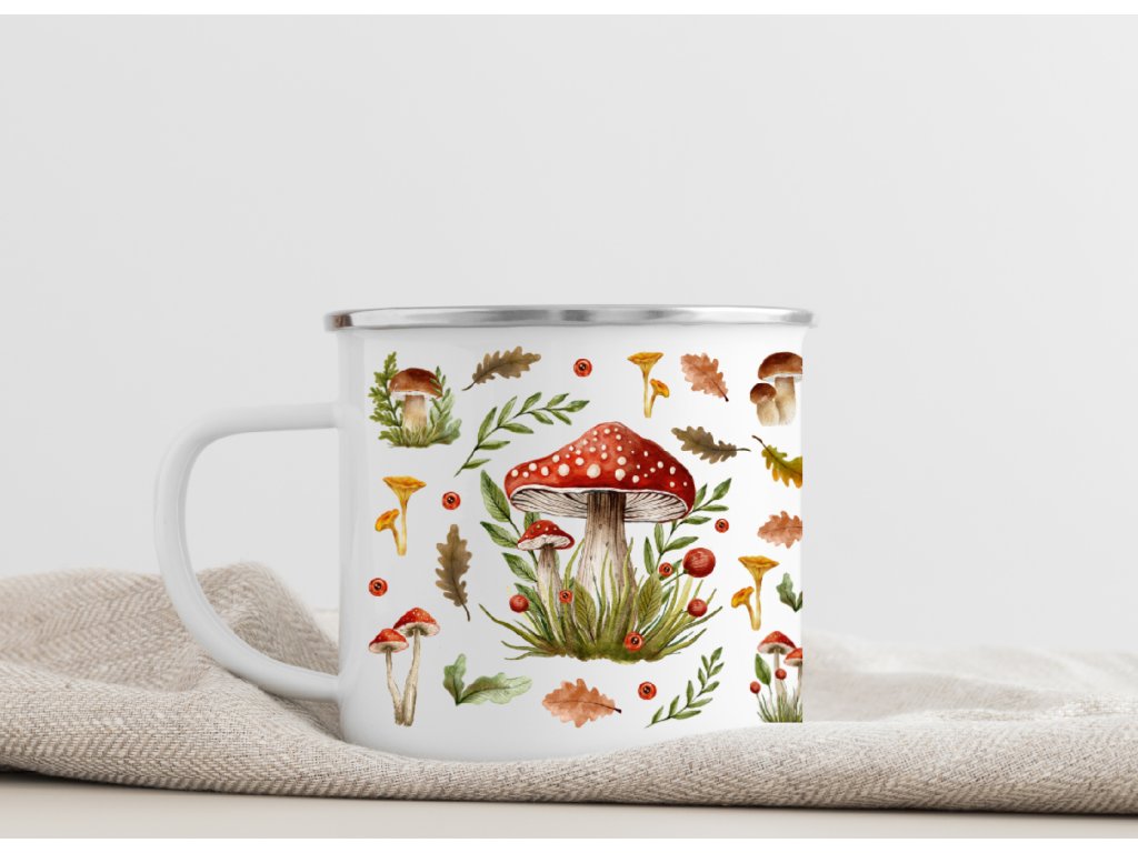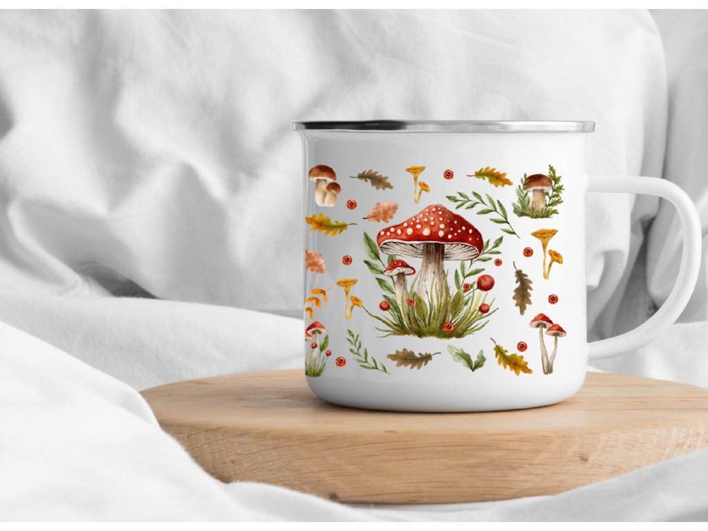Plecháček s houbami – smaltovaný hrnek s lesním motivem 🍄✨