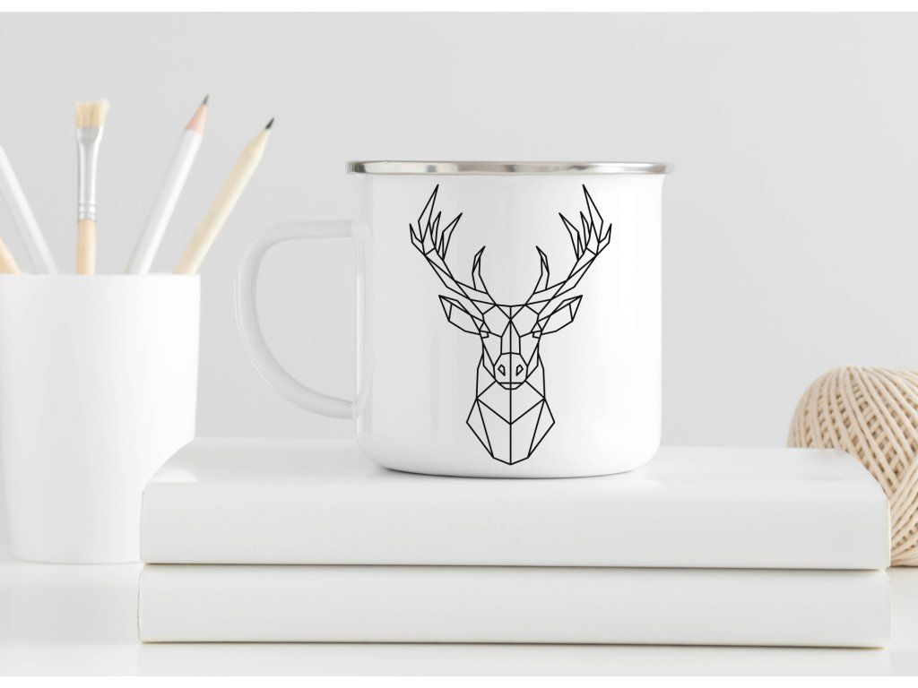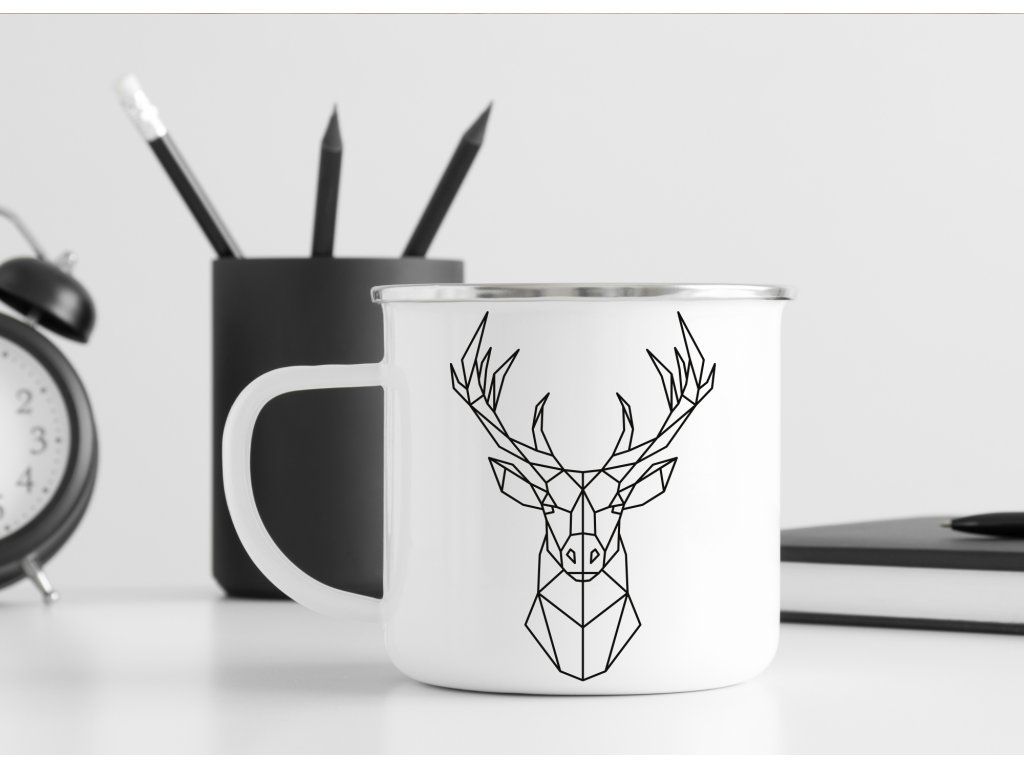 Minimalistický smaltovaný hrnek s geometrickým jelenem 🦌🤍 Stylový parťák na kávu do přírody i domů.