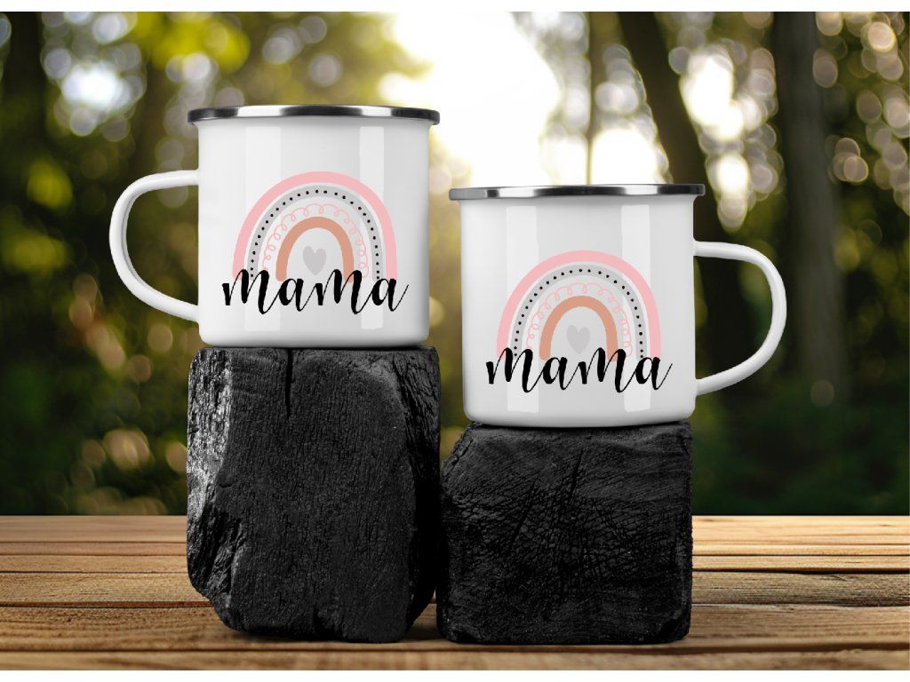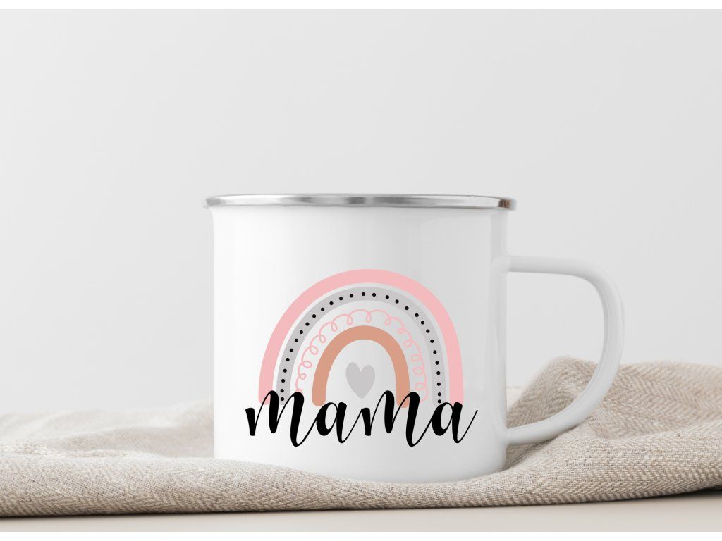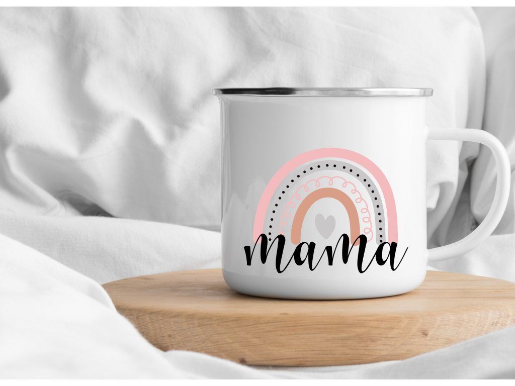 Smaltovaný plecháček pro maminku s nápisem Mama a jemnou duhou 🌈💗 Krásný dárek na výlety, chalupu i domácí pohodu.