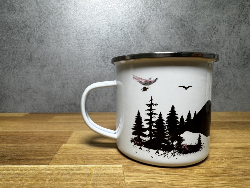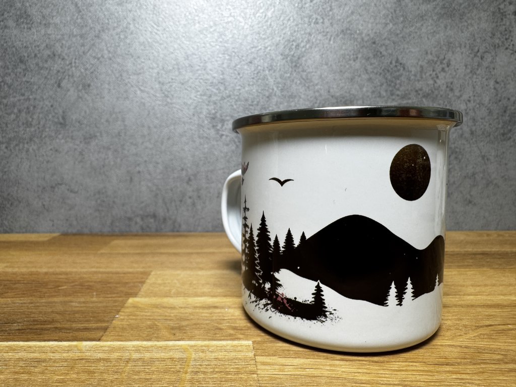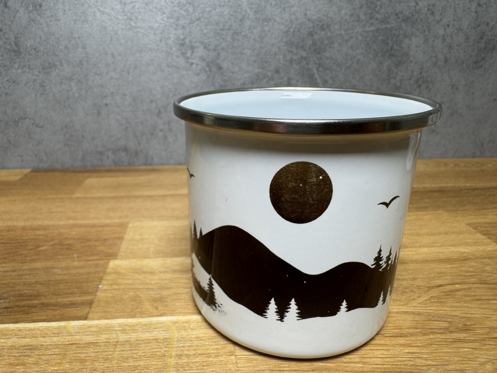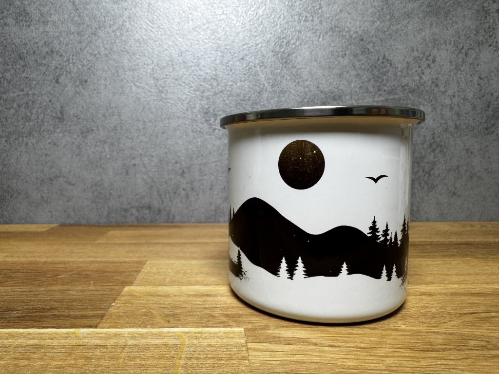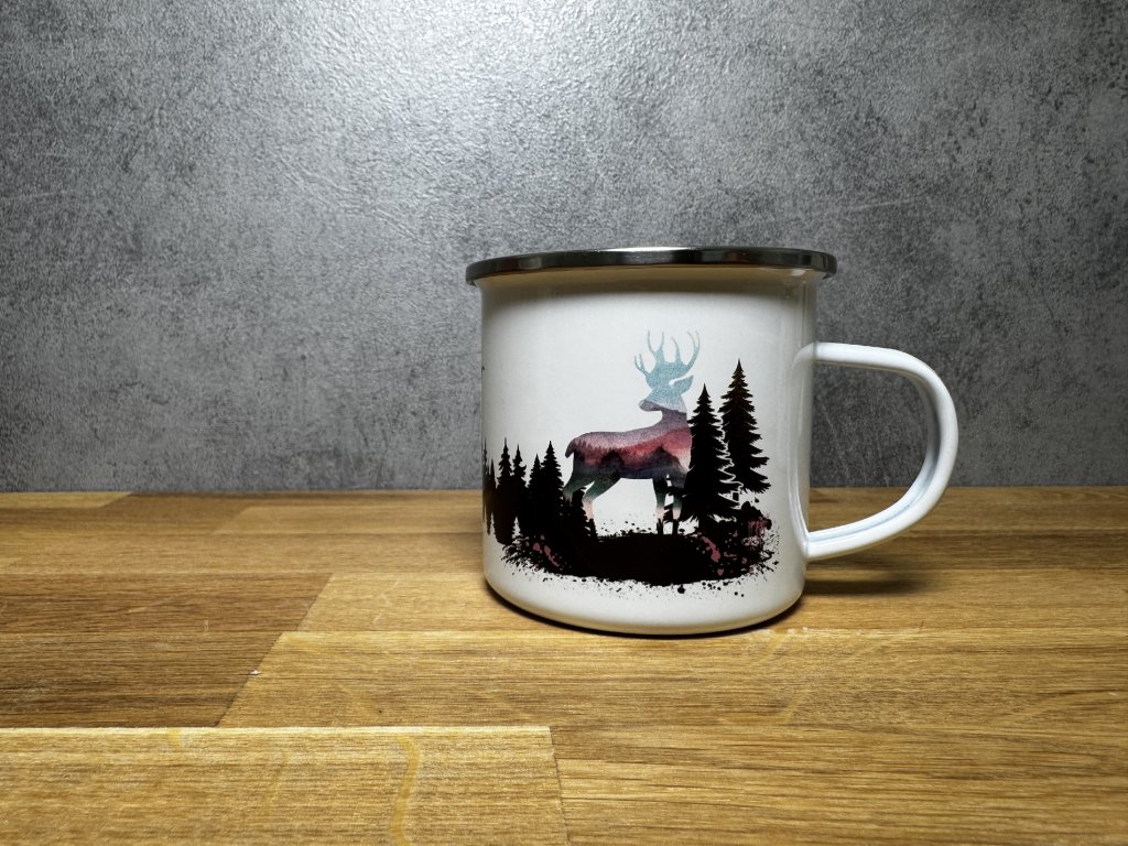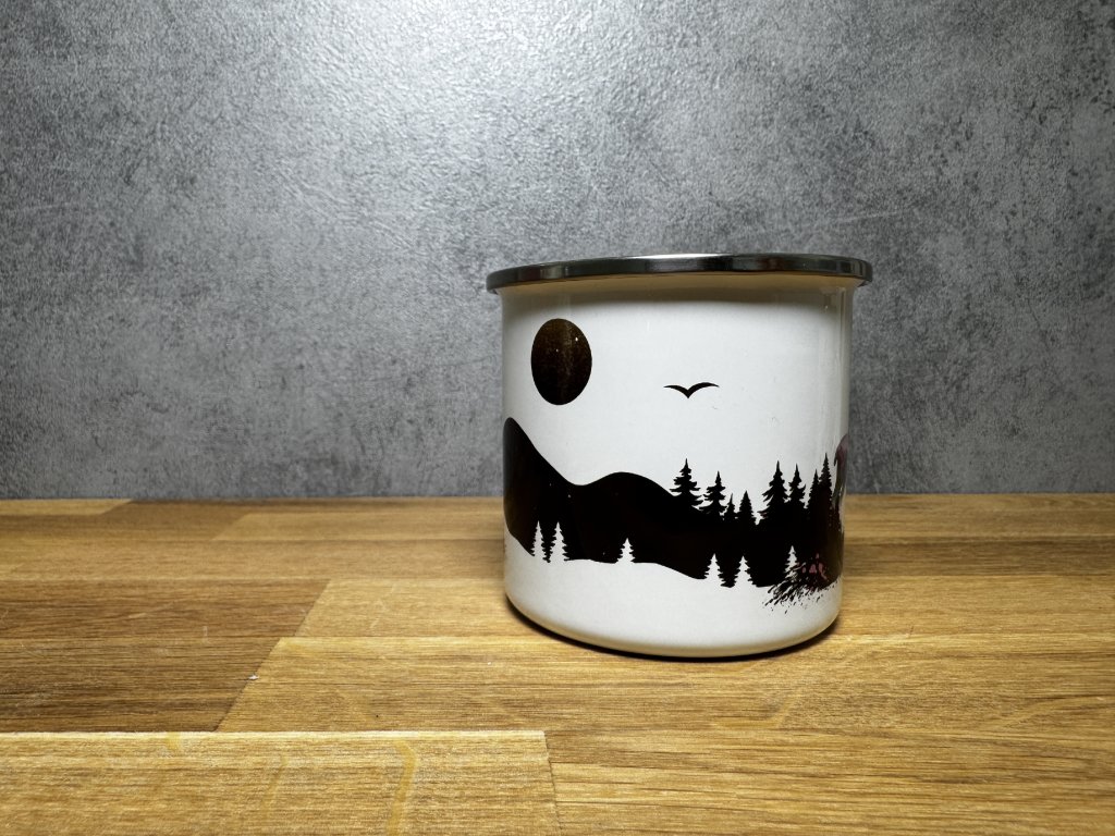 Tento smaltovaný plecháček s motivem srnce v horské krajině je jediným kouskem svého druhu, který vznikl při přípravě šumavské edice. Potisk je krásně výrazný, čistý a drží perfektně – pouze měsíček na obloze je nedopečený, což je čistě kosmetická vada a nemá žádný vliv na používání.