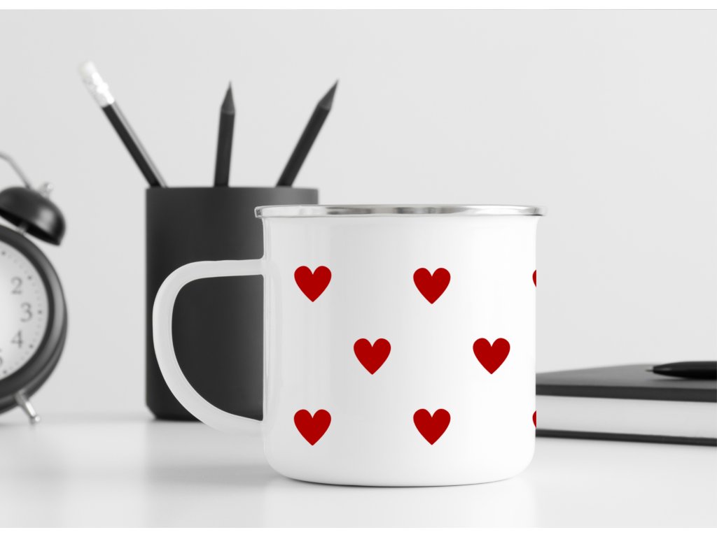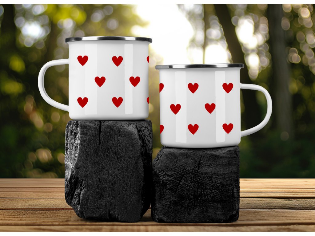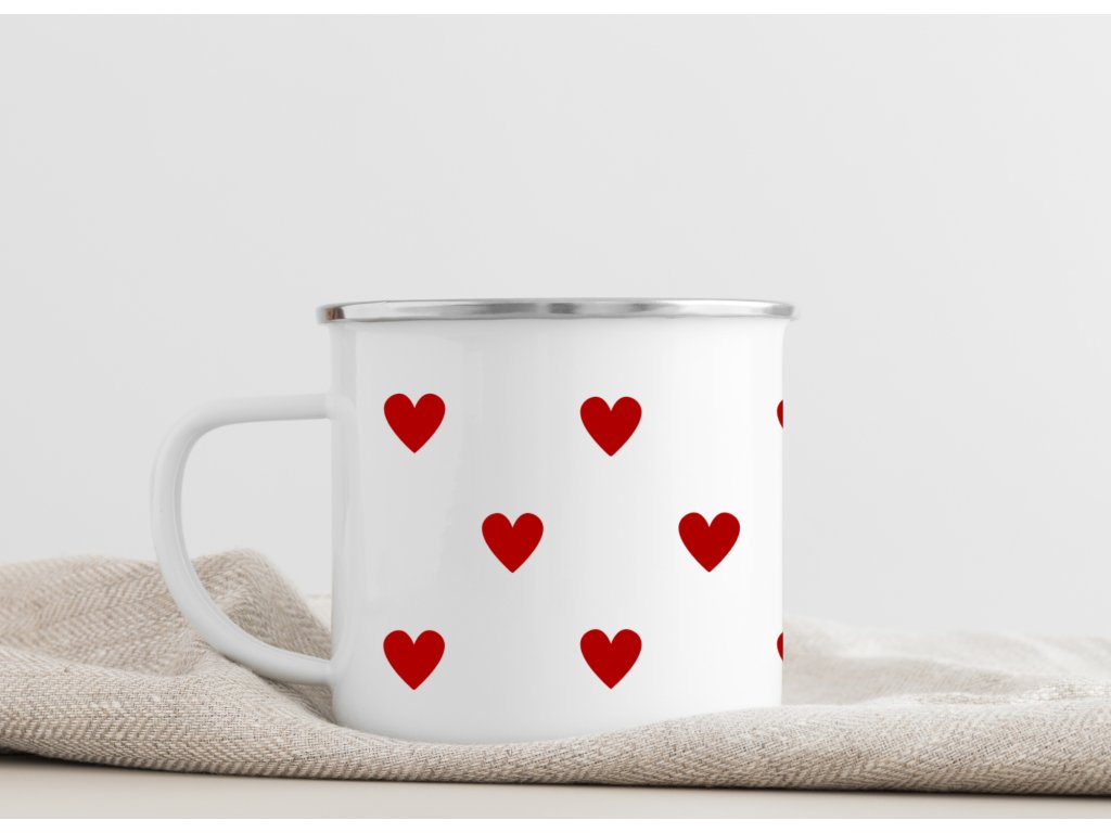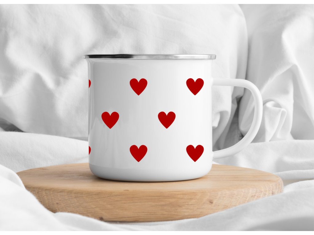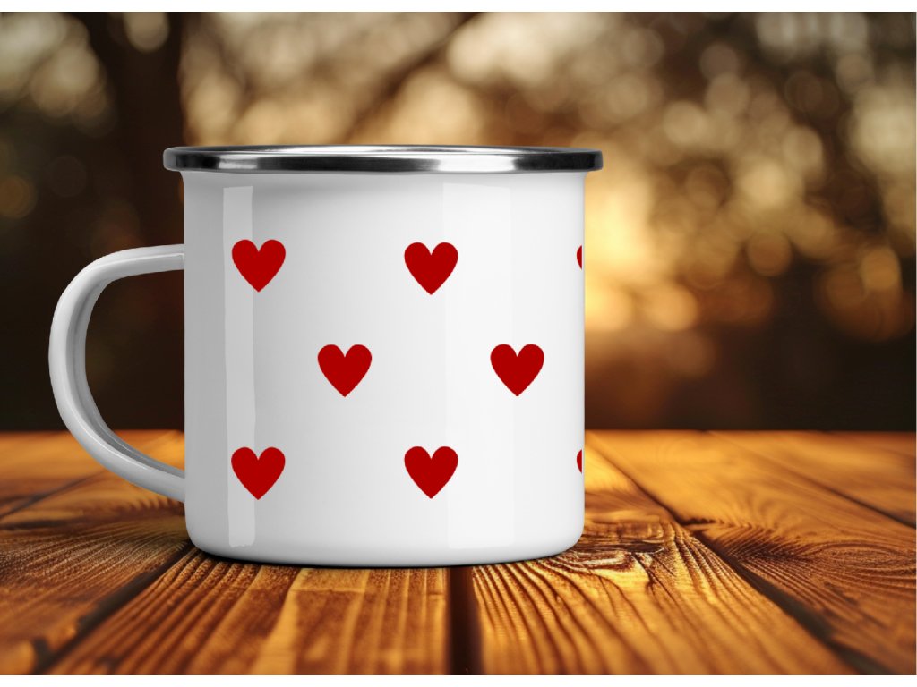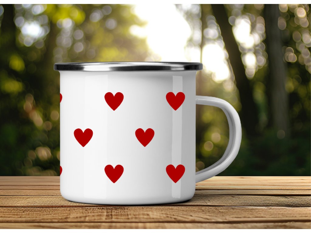 Roztomilý smaltovaný plecháček se srdíčky ❤️ – jednoduchý, nadčasový a perfektní na kafe, čaj i horkou čokoládu doma, na chalupě i na cestách.