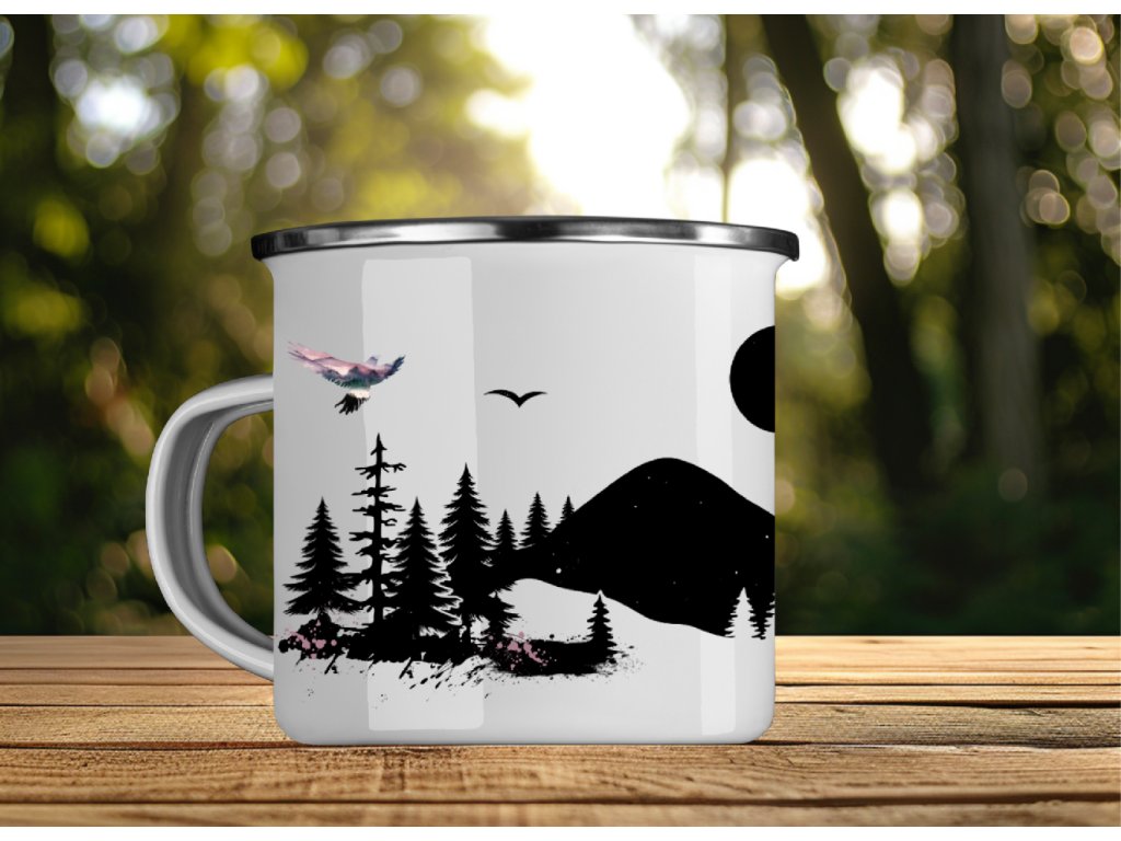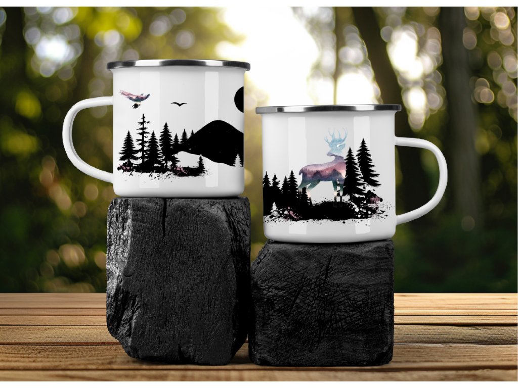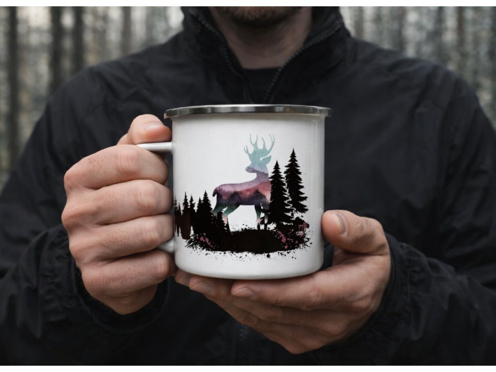 Smaltovaný plecháček s jemným motivem srnce v lesní krajině 🦌🌲 Stylový hrnek pro milovníky přírody, lesa a šumavské atmosféry – na doma, chatu i výlety.