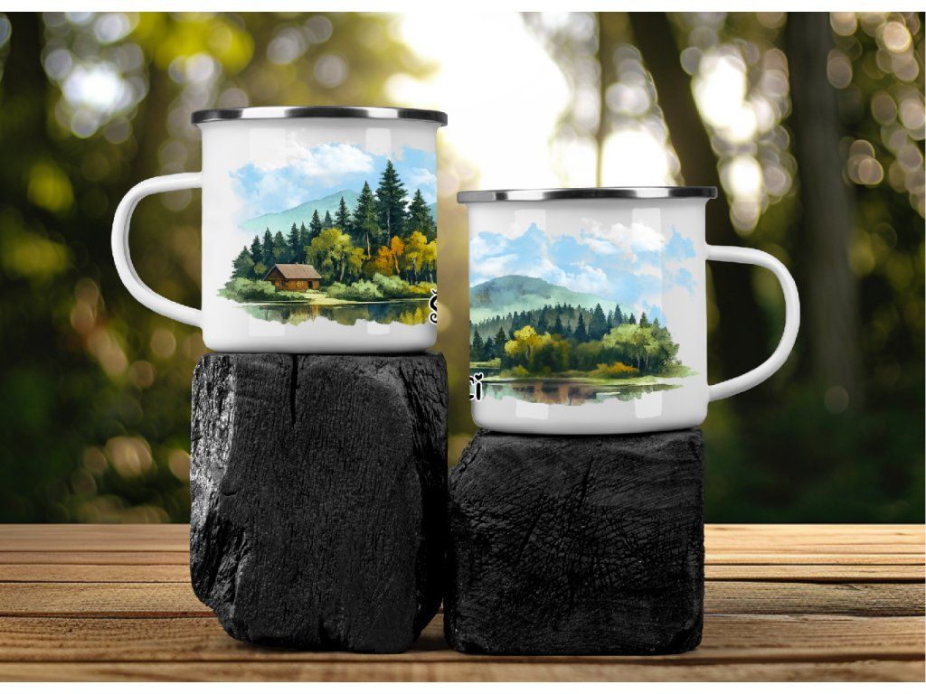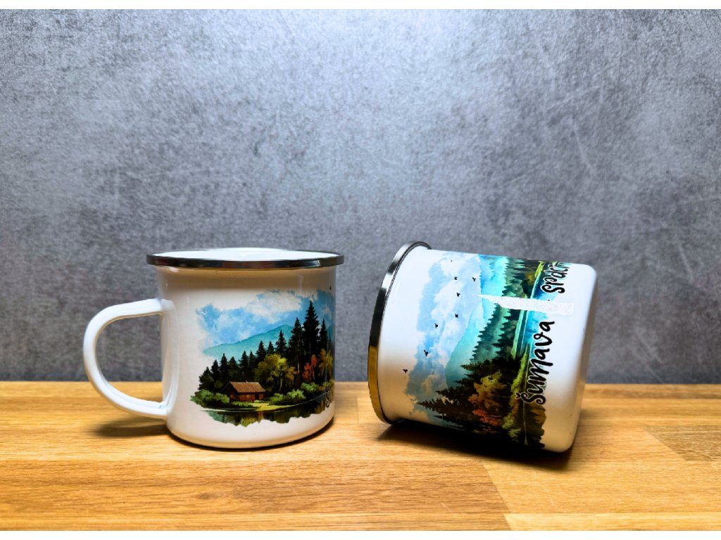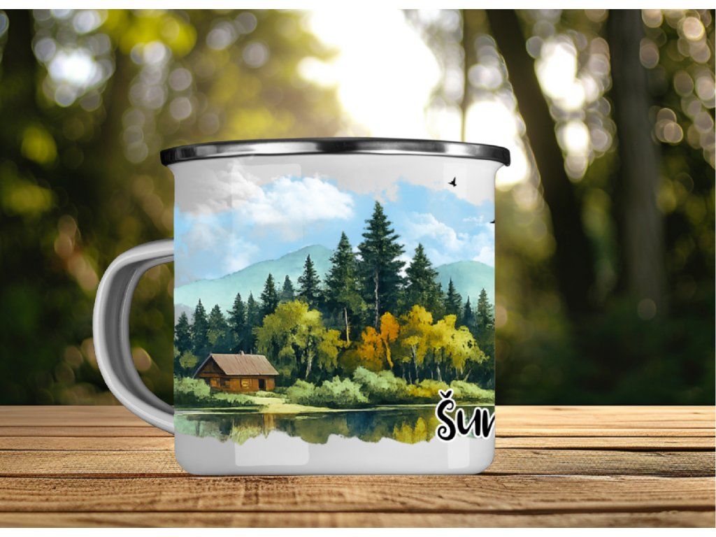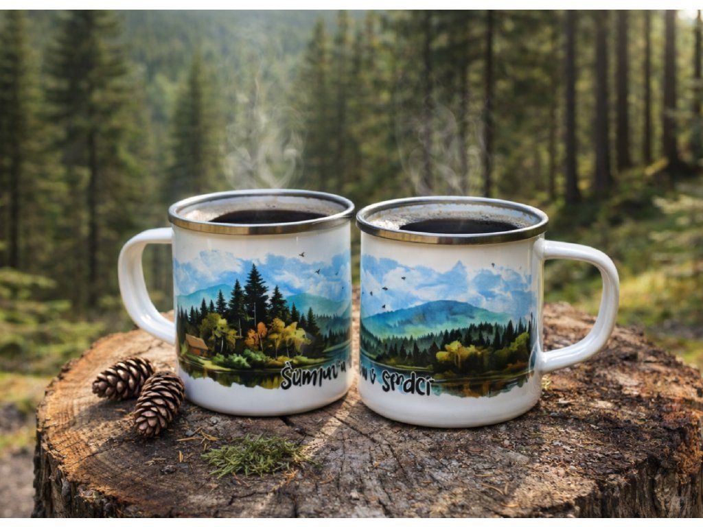 Šumava je místo, kam se člověk vrací – aspoň v myšlenkách 🌲🏞️ Tenhle plecháček s jemným akvarelovým motivem šumavské krajiny a nápisem „Šumava v srdci“ ti tu atmosféru připomene pokaždé, když si do něj naliješ kávu nebo čaj.