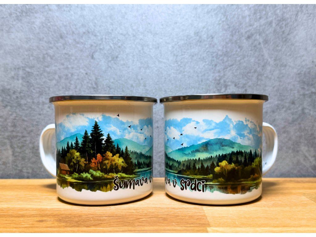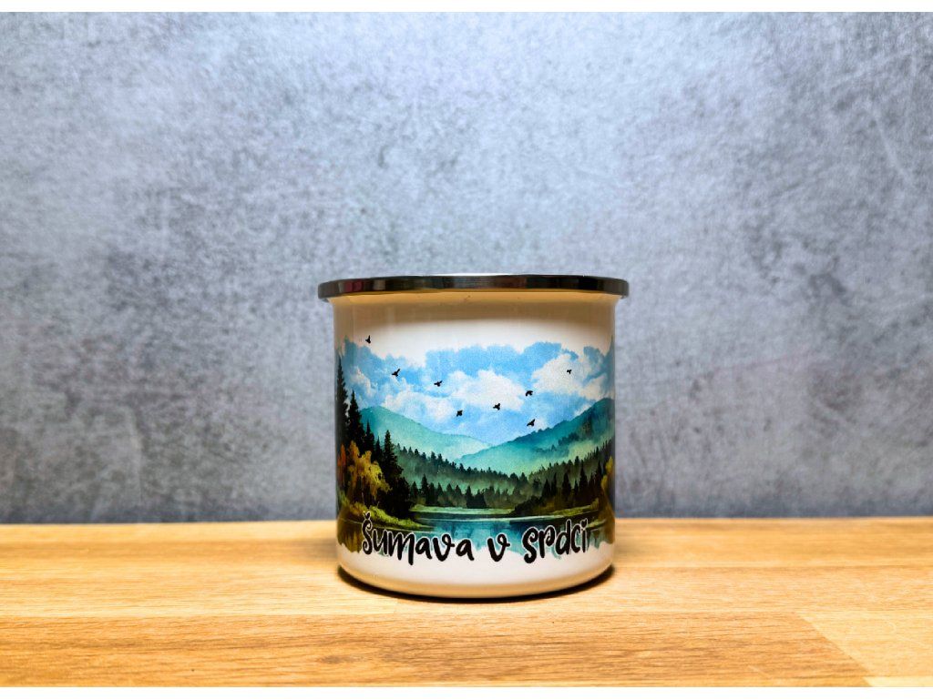 Smaltovaný plecháček s akvarelovou šumavskou krajinou a nápisem „Šumava v srdci“ 🌲 Ideální na výlety, chalupu i kempování.