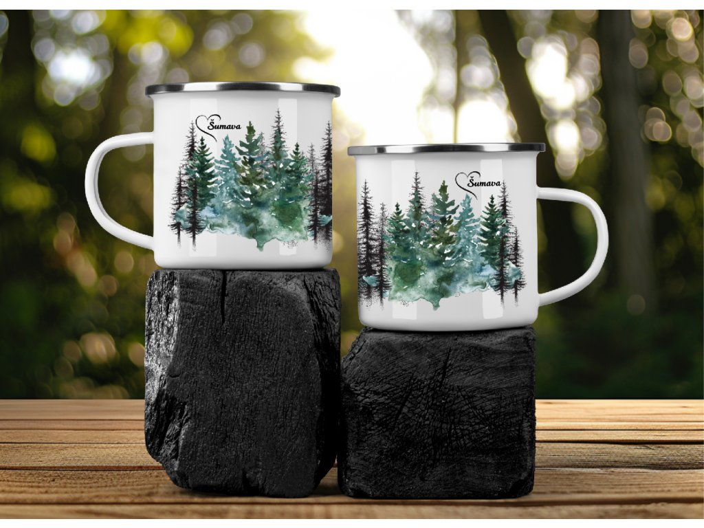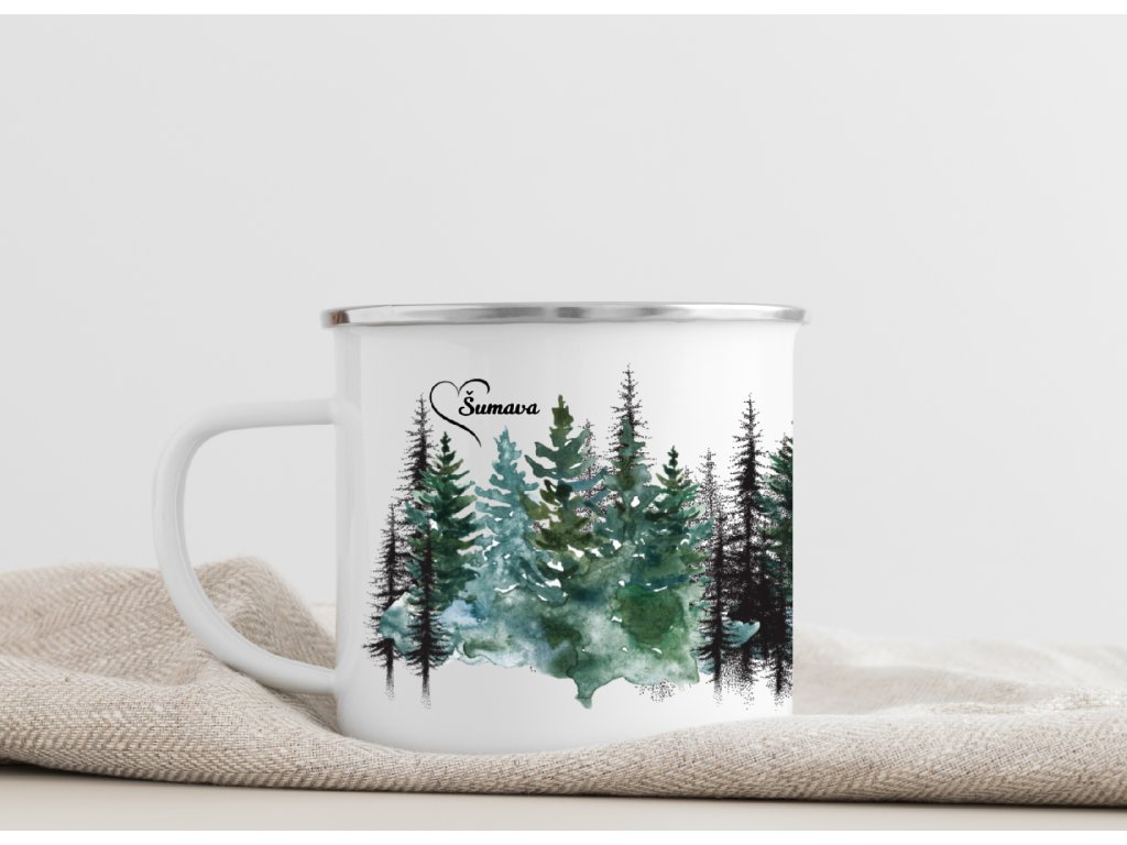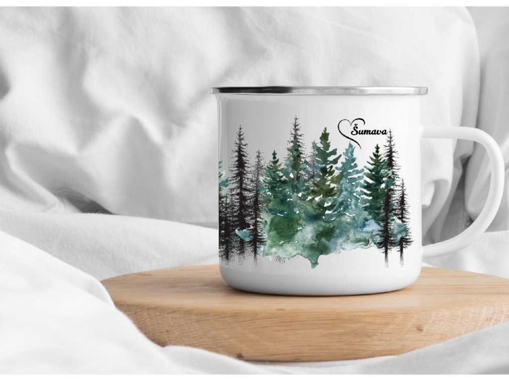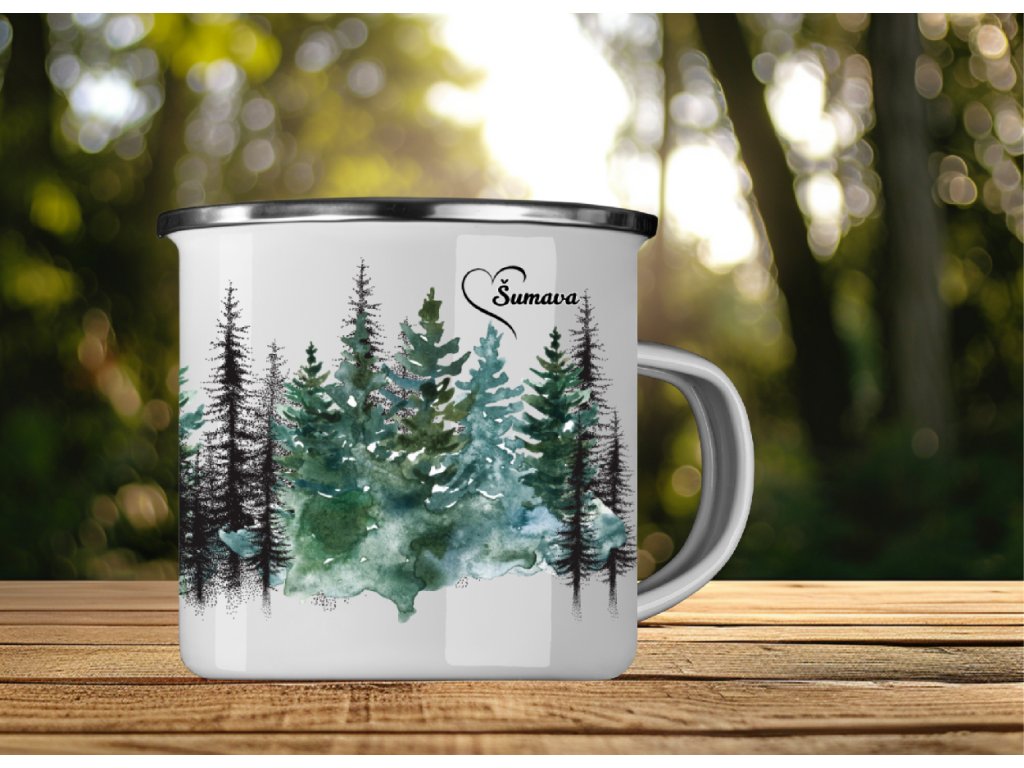 Plecháček Šumava 380 ml – Smaltovaný hrnek s motivem šumavských smrků. Ideální společník na doma, výlety i kempování 🌲☕