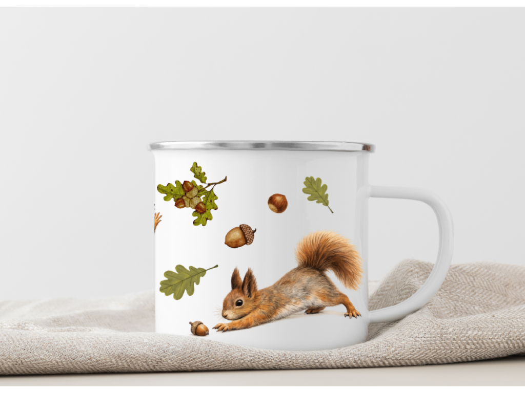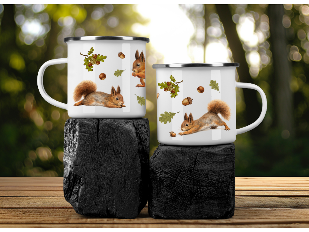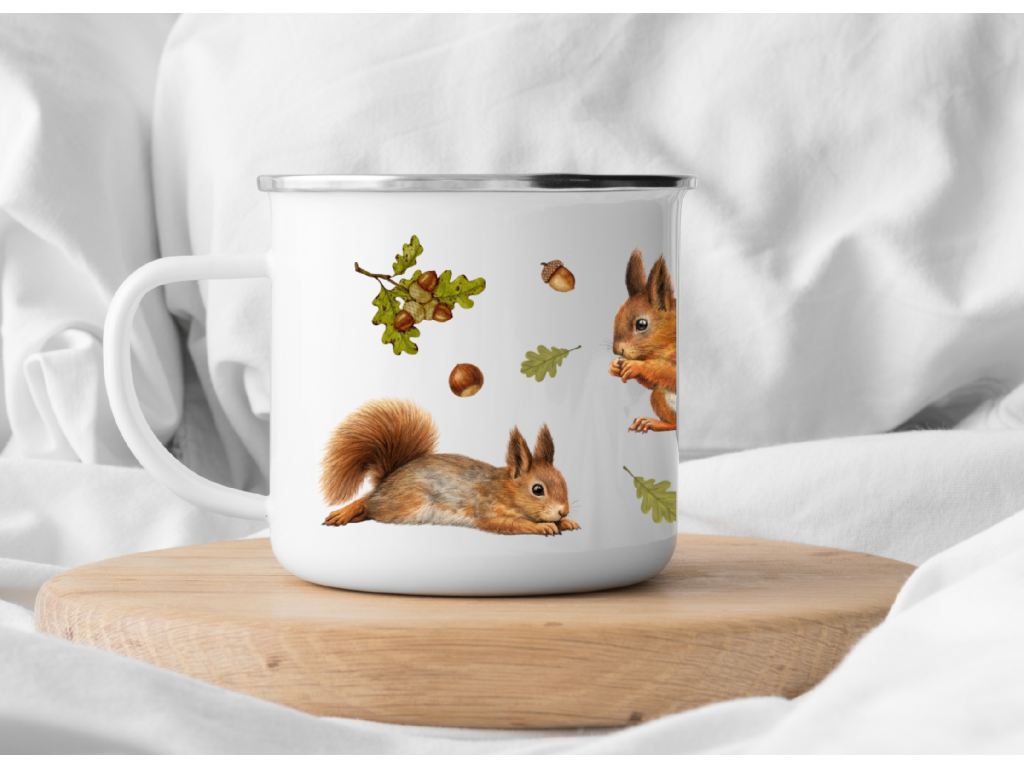 Originální plecháček s motivem veverek potěší milovníky lesa, přírody a šumavských zvířat. Roztomilý design s veverkami, žaludy a listy se hodí na doma, na chatu i na výlety.