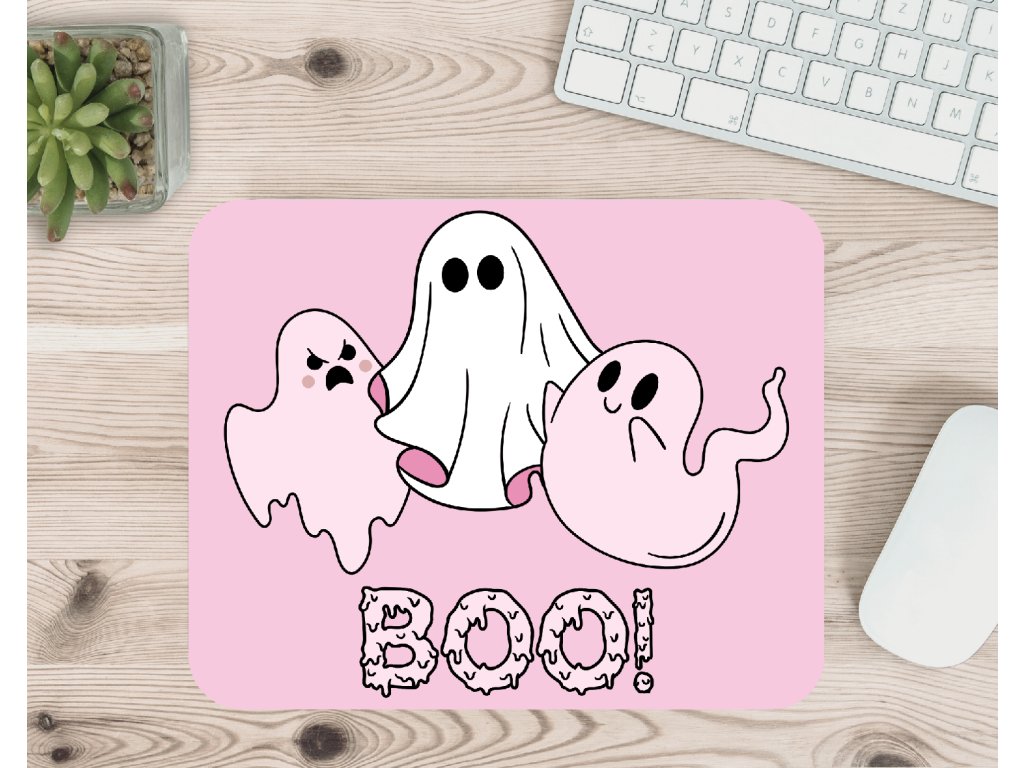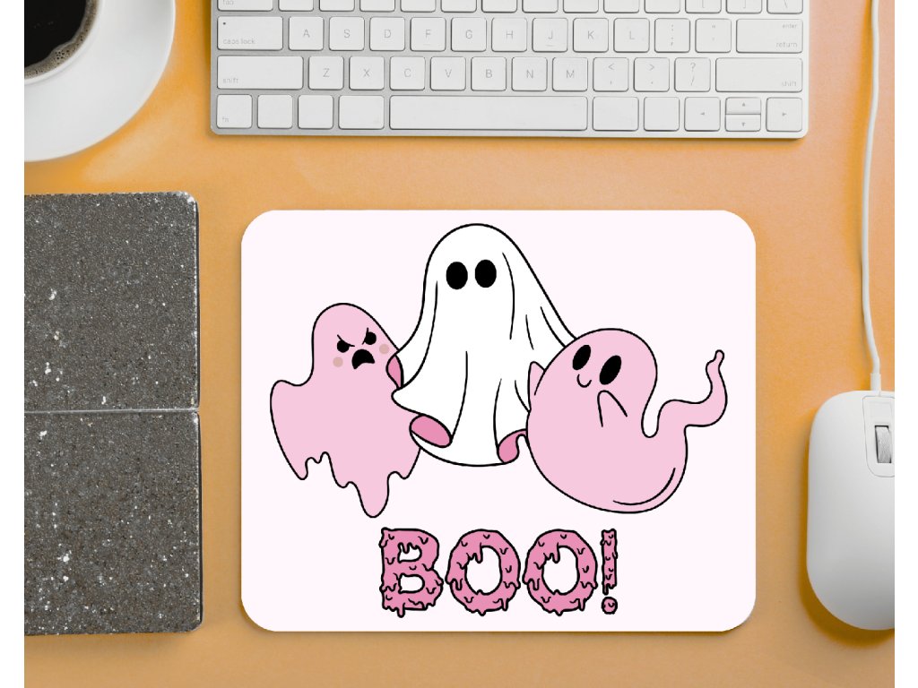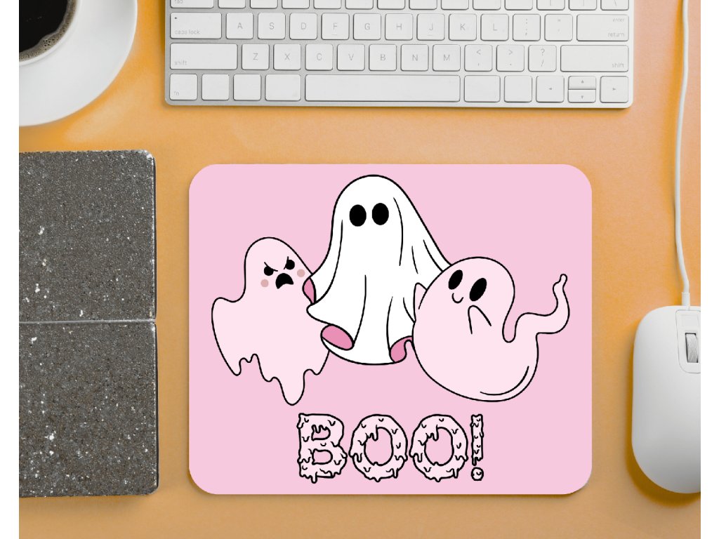 Stylová podložka pod myš s roztomilými duchy a nápisem „BOO“, ideální pro Halloween i celou podzimní sezónu. 🎃👻