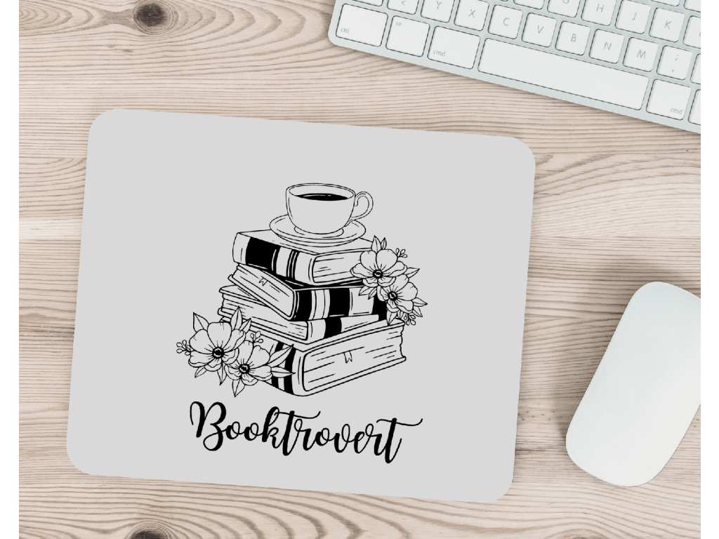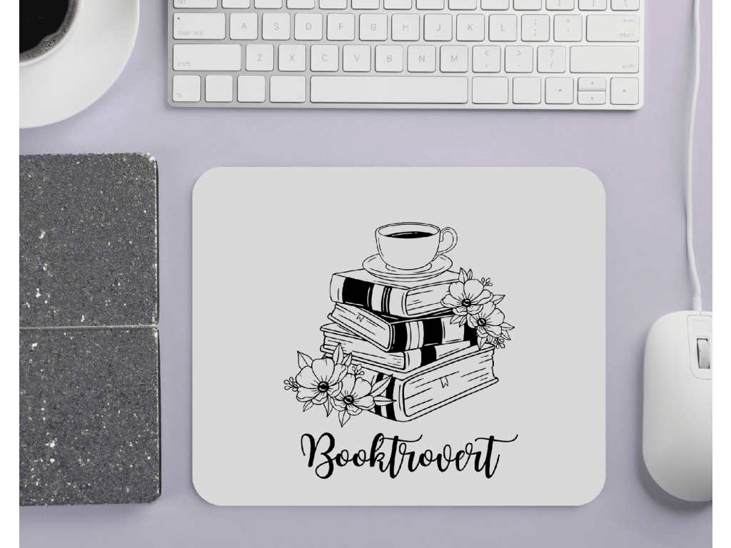 Podložka pod myš s motivem knih, kávy a nápisem Booktrovert potěší všechny knihomoly. Stylový doplněk na pracovní stůl i krásný dárek pro knihomolku.