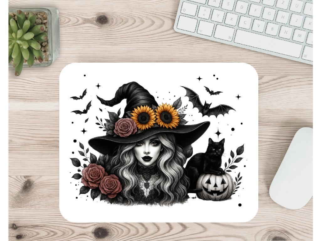 Podzimní podložka pod myš s motivem tajemné čarodějky, kočky a netopýrů. Ideální doplněk pro milovníky Halloweenu a magické estetiky. 🖤🎃