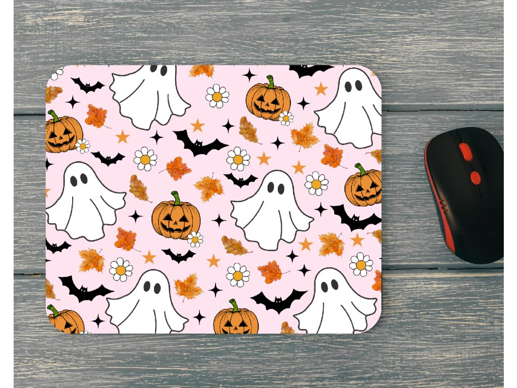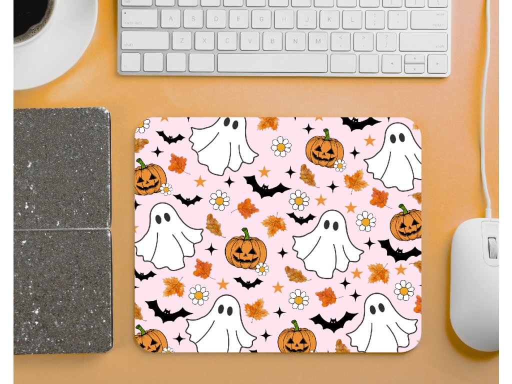 Stylová podložka pod myš s růžovým pozadím, duchy, dýněmi a podzimními motivy. Ideální doplněk pro Halloween i podzimní atmosféru. 🎃👻