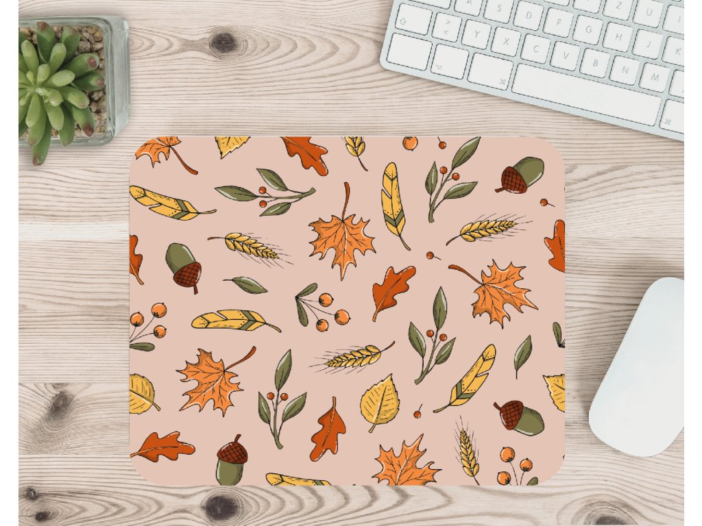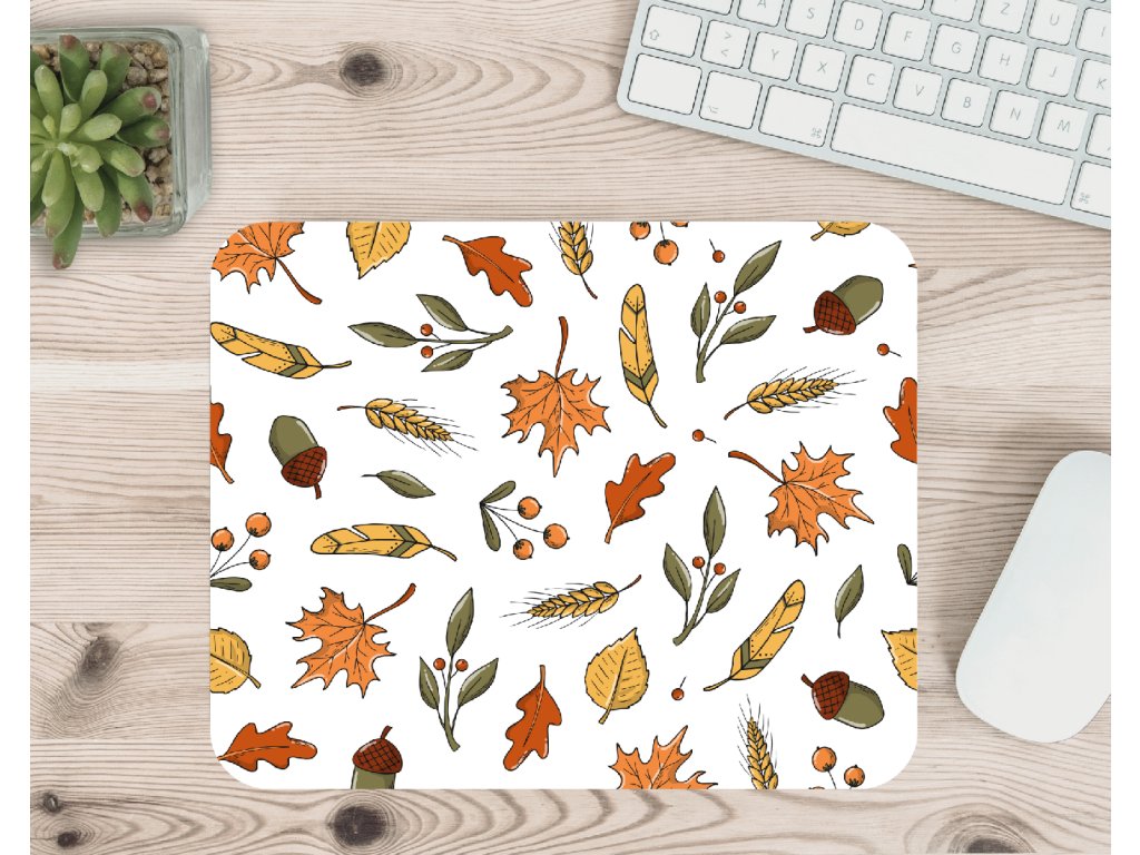 Stylová podložka pod myš s motivem listů, žaludů a větviček v podzimních barvách. 🍂