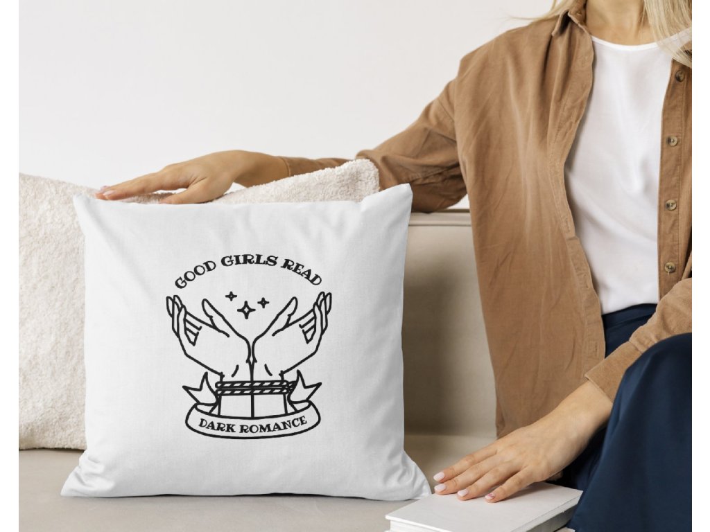 Povlak na polštář „Good girls read Dark Romance“ s jemným mystickým motivem rukou. Perfektní pro milovnice Dark Romance a temné estetiky do čtecího koutku. ✨