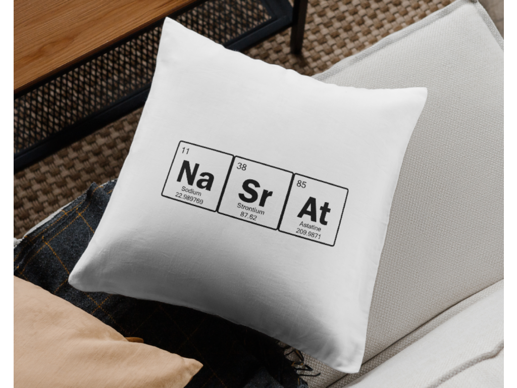 40x40 cm - Povlak na polštářek s nápisem Nasrat stylizovaným jako chemické prvky potěší milovníky ironie, sarkasmu a vtipných motivů. Skvělý doplněk do interiéru i jako netradiční dárek.