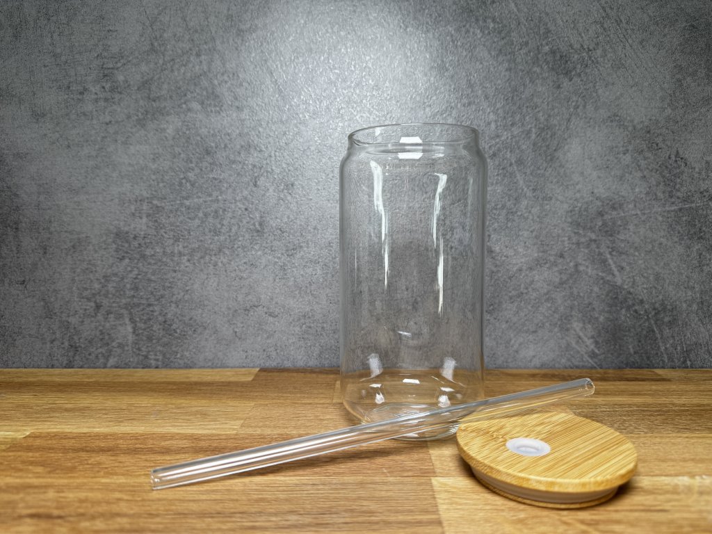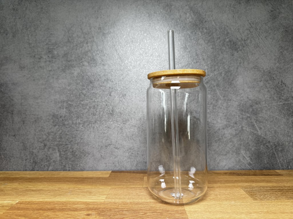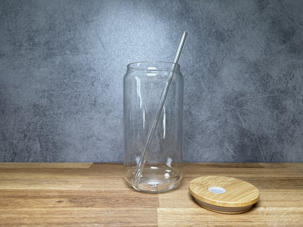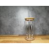 Sklenička s vlastním potiskem - na přání - 550 ml - sklenice ve tvaru plechovky s bambusovým víčkem a skleněným brčkem