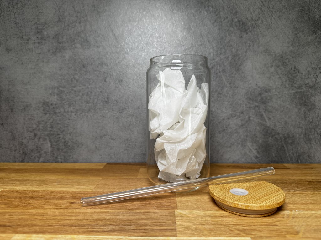 - Set: sklenička + bambusové víčko + skleněné brčko (rovné nebo zahnuté – dle skladové dostupnosti) + čisticí kartáček na brčko