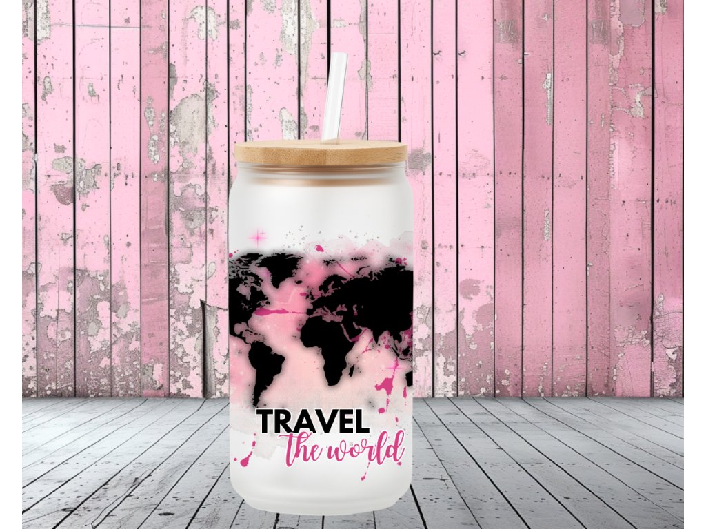 550 ml - matná sklenička s potiskem - Cestování - Travel the World - růžová