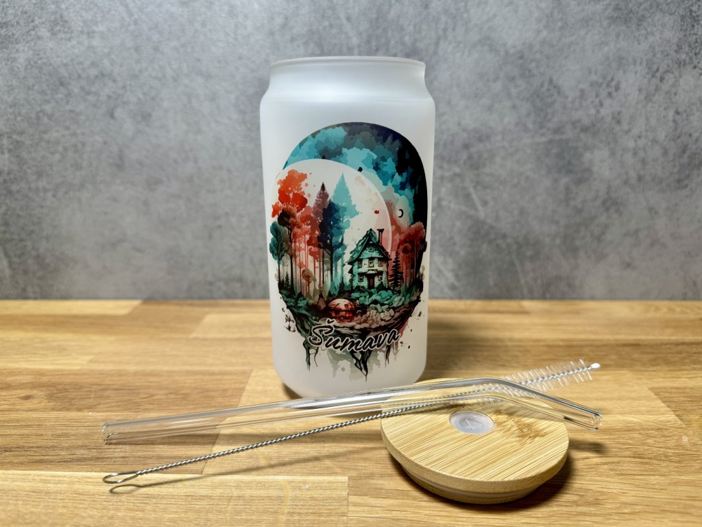- Sklenička s potiskem + bambusové víčko, skleněné brčko a čistící kartáček – ideální pro stylové pití