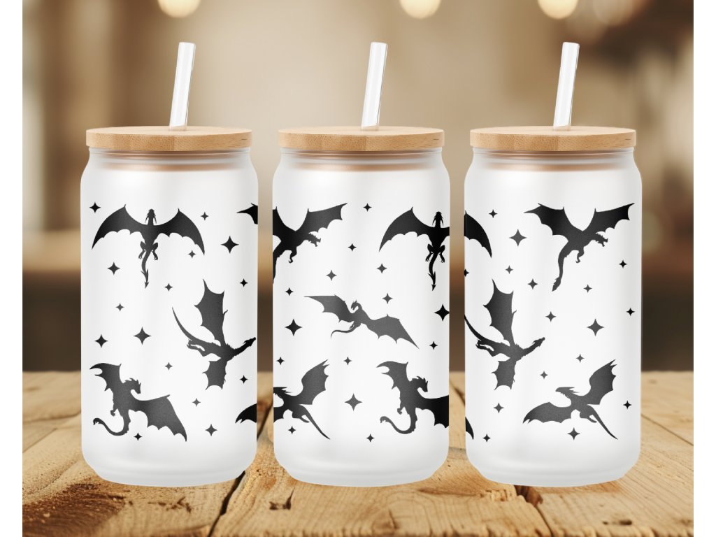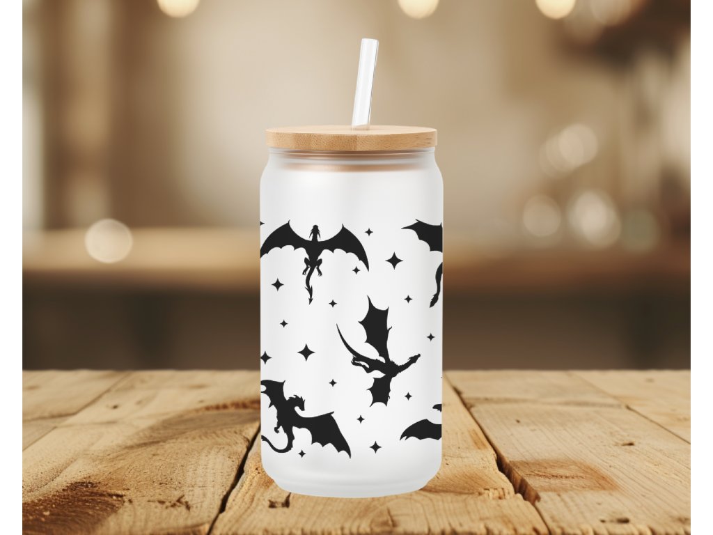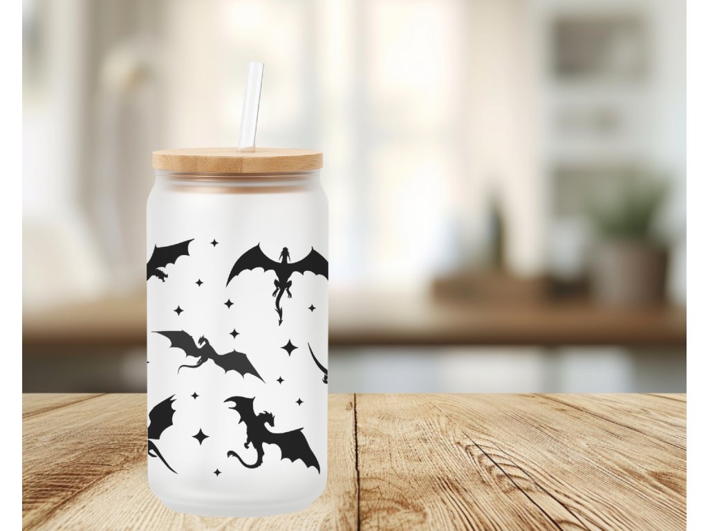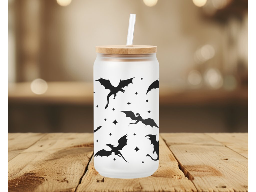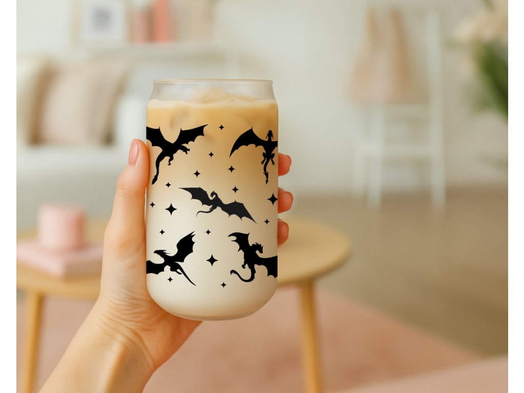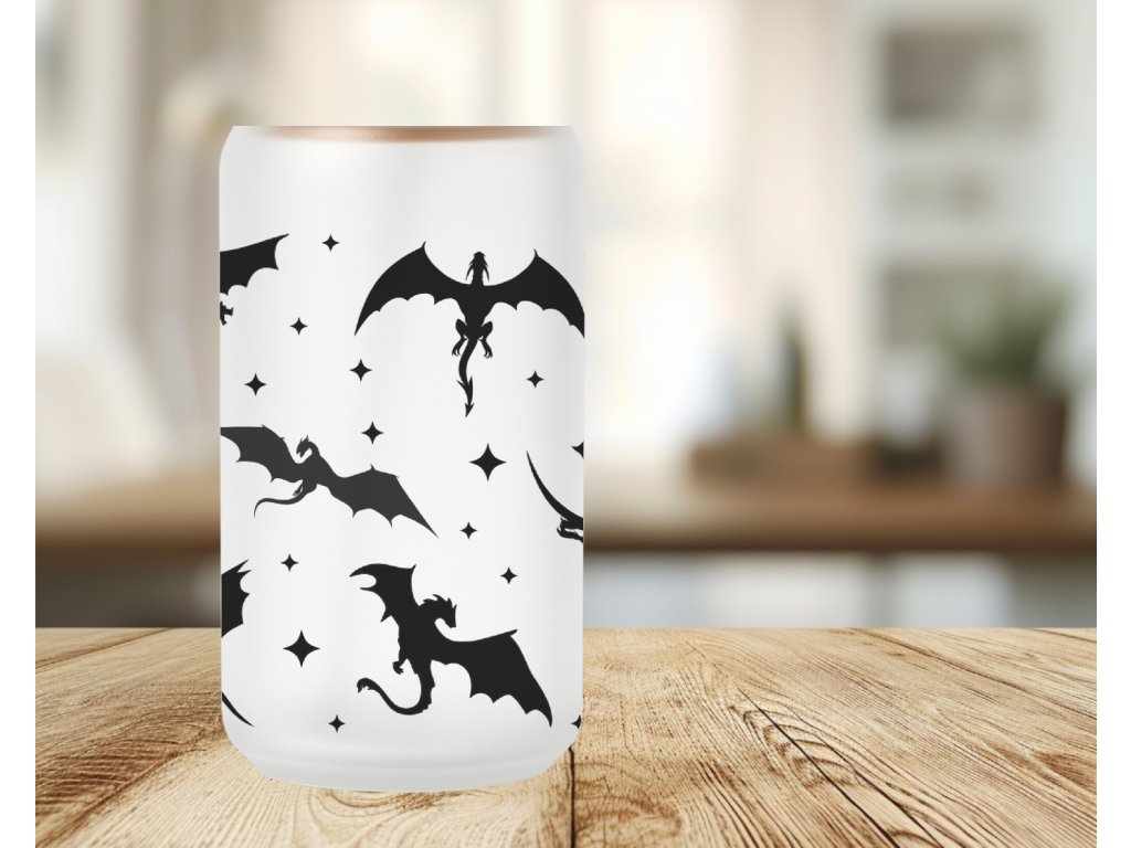 Jemná, minimalistická – a přesto nepřehlédnutelná. 🐉 Tahle sklenička s potiskem draků spojuje matný podklad s výraznými černými siluetami létajících draků a drobnými hvězdami. Výsledkem je moderní fantasy vibe, který si zamiluješ na první pohled.
