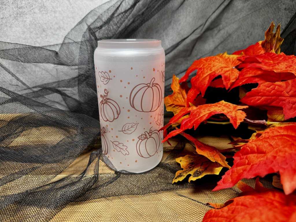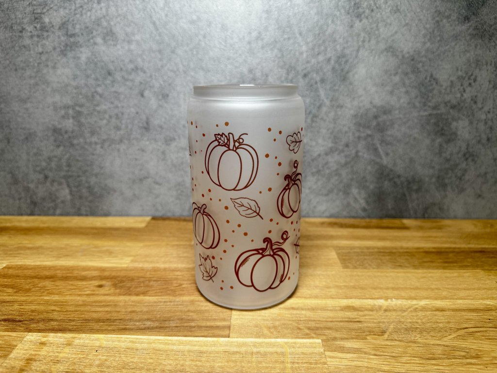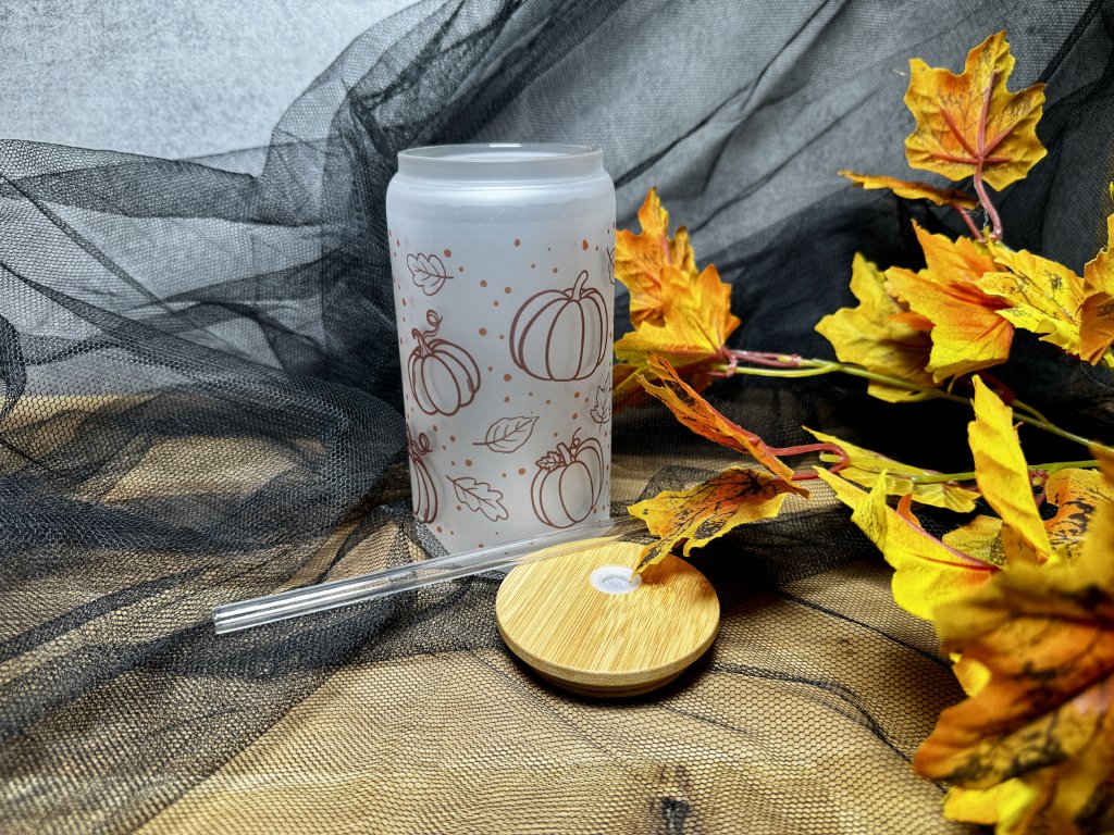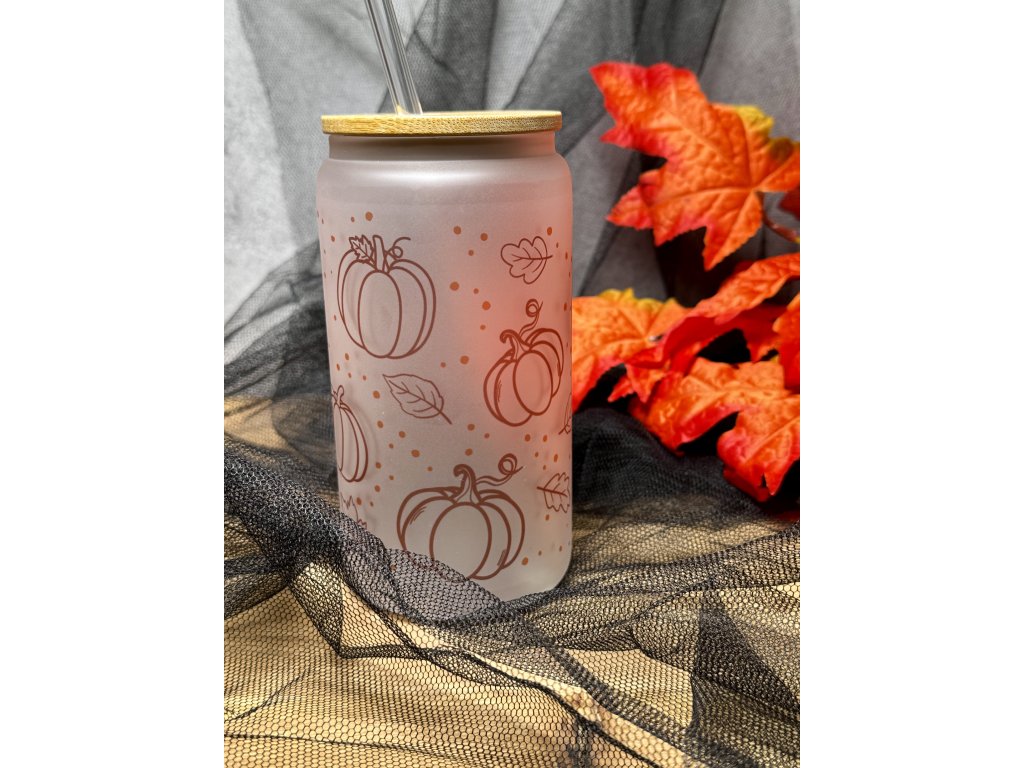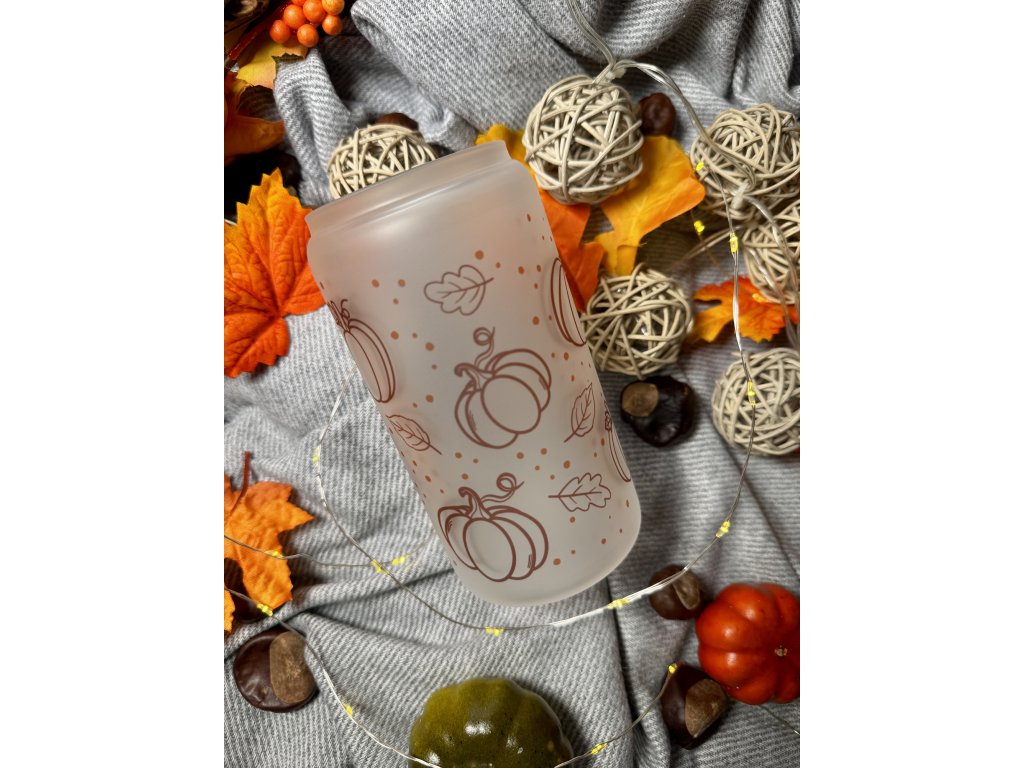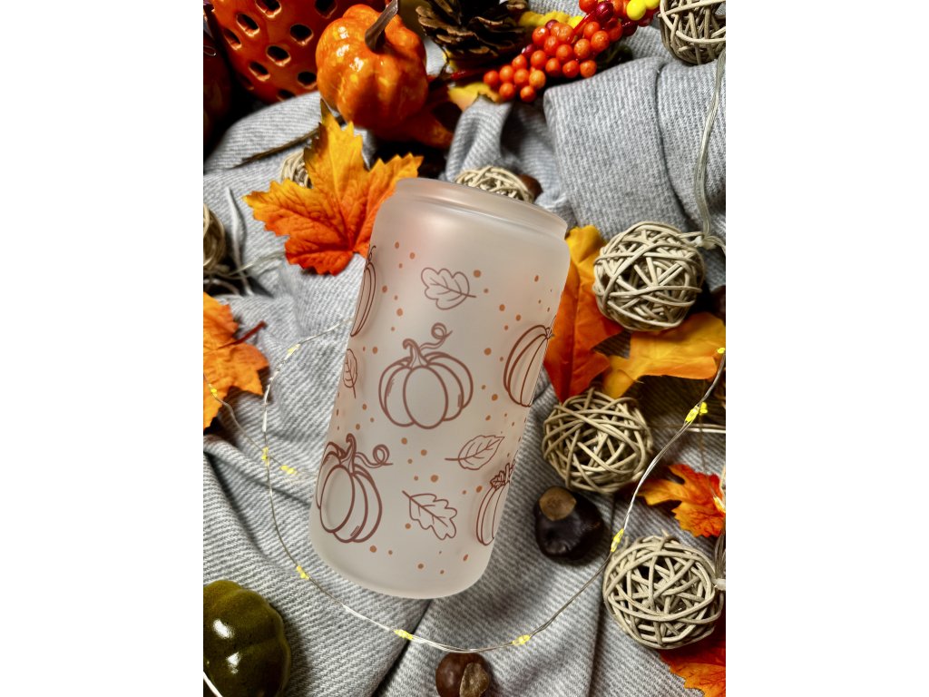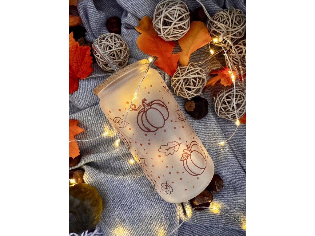 550 ml - Podzimní sklenička ve tvaru plechovky matné sklo - Dýně s listy aesthetic
