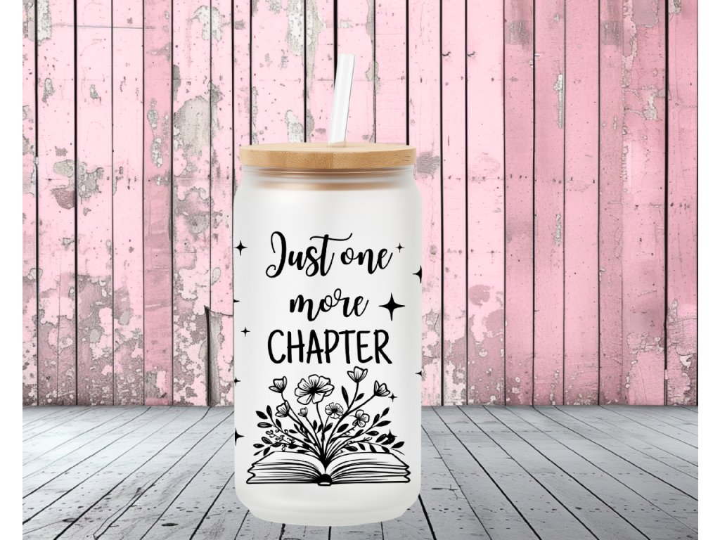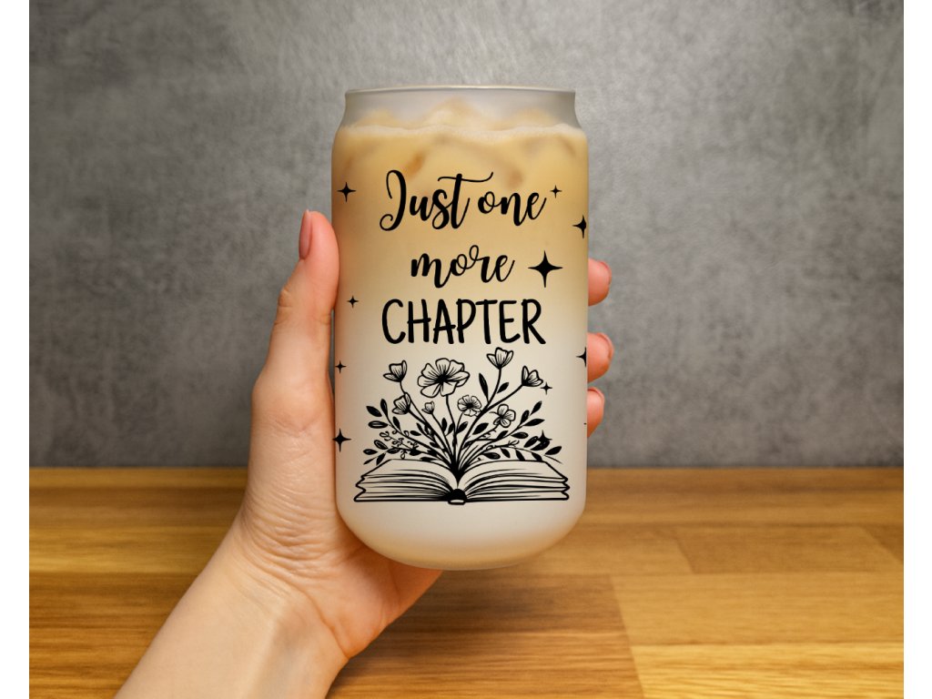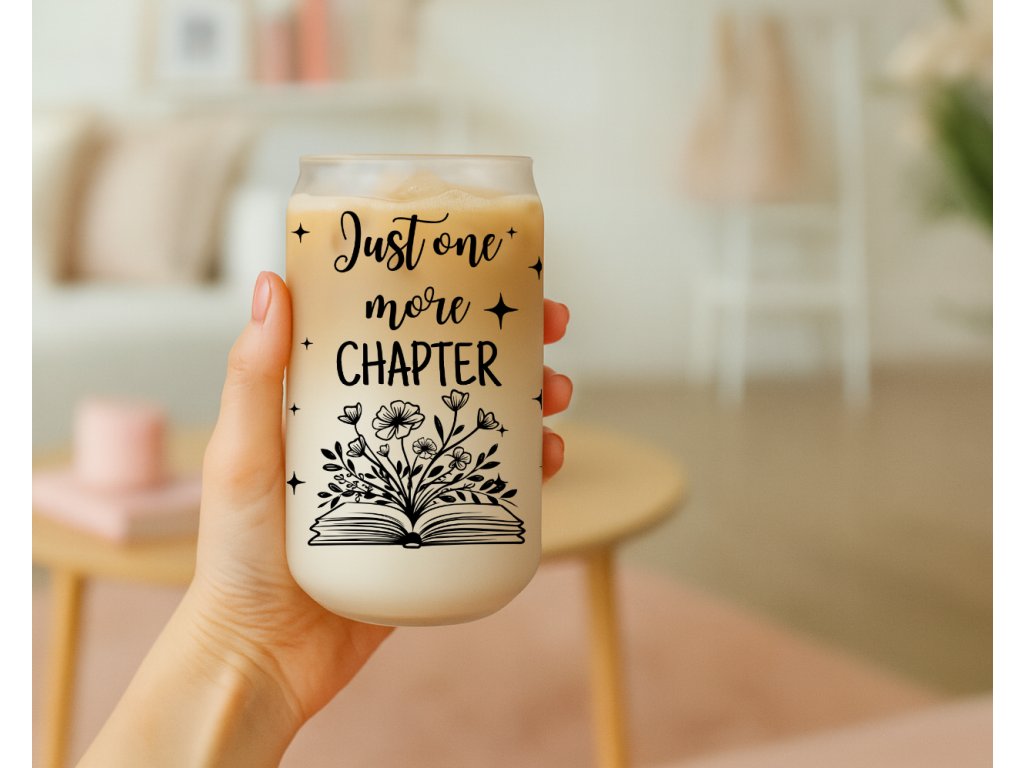 Jedna kapitola… a pak další… a další 😄 Pokud se v tom poznáváte, tahle sklenička je přesně pro vás! Sklenička s nápisem „Just one more chapter“ a ilustrací otevřené knihy s květinami potěší každou milovnici čtení – doma, v práci i na cestách.
