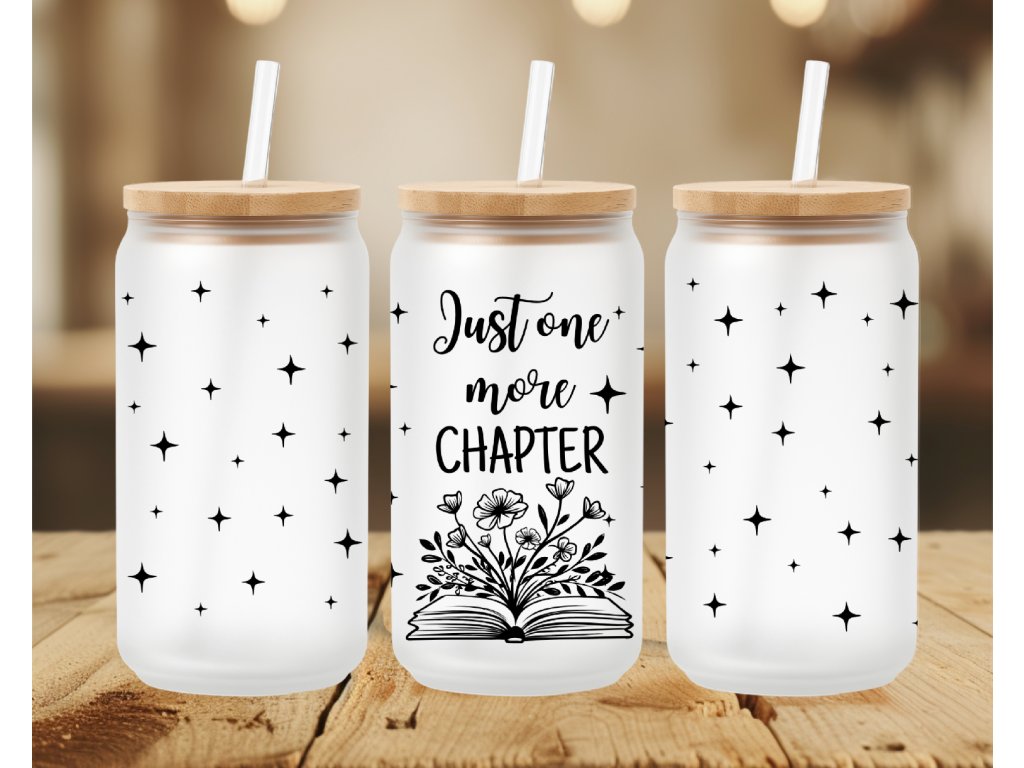 Sklenička „Just one more chapter“ pro všechny knihomolky – jemný motiv hvězdiček a otevřená kniha s květinami. Ideální na ledovou kávu i čaj. ✨