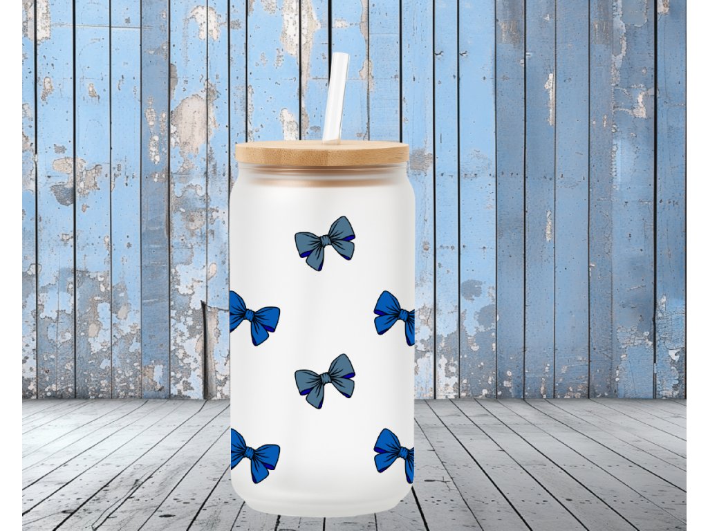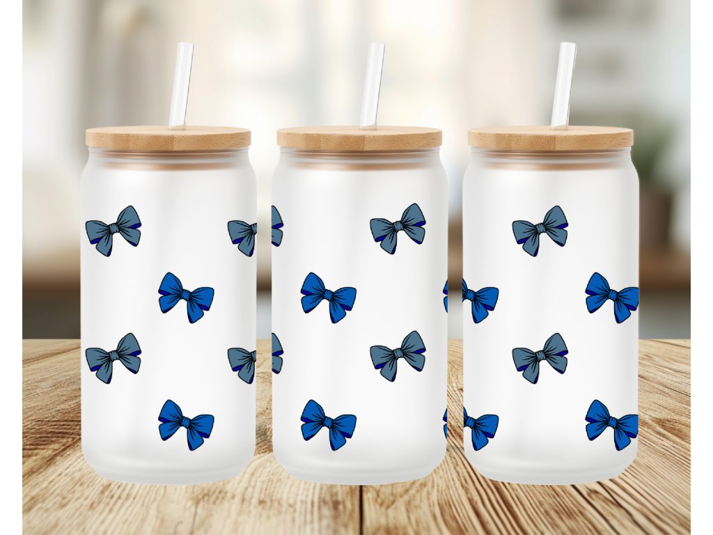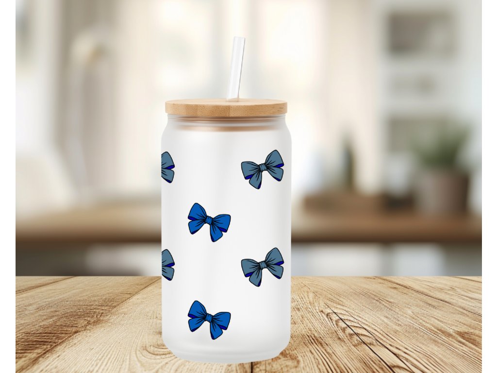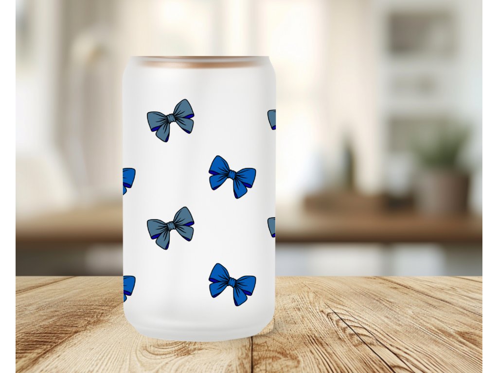 550 ml - Matná sklenička ve tvaru plechovky s modrými mašličkami