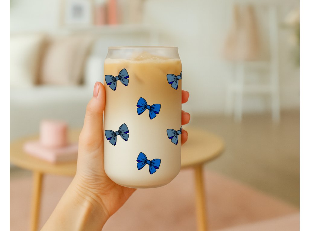 Sklenice s potiskem modrých mašliček je ideální volbou pro každého, kdo miluje jemné motivy a stylové doplňky. Je skvělá na ledovou kávu, limonádu, čaj i smoothie a zároveň se stane krásným doplňkem pracovního stolu, kuchyně nebo pikniku s přáteli.